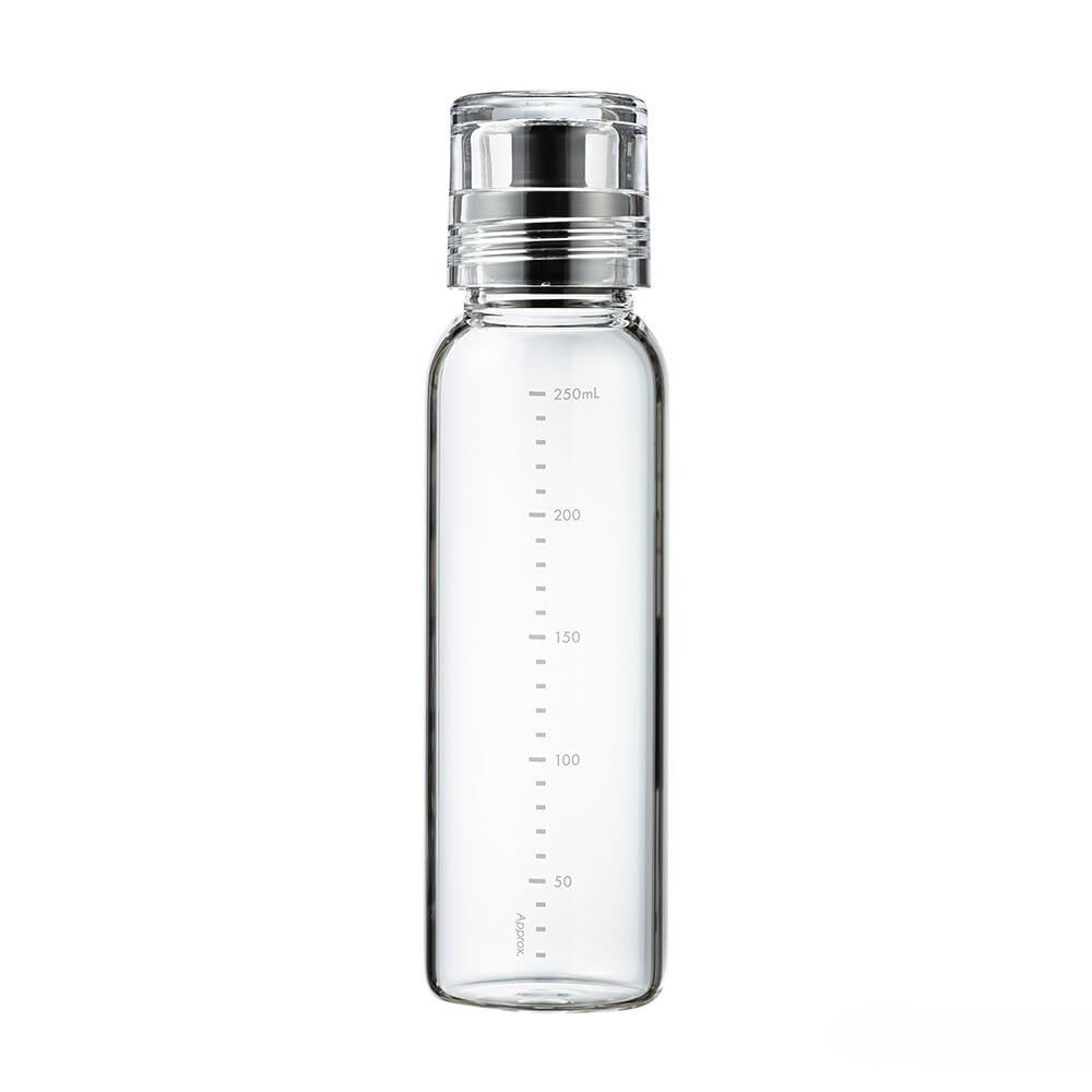 【商品詳細】本体サイズ:幅5.5×奥行5.5×高さ20.3・口径3.7cm、本体重量:約237g、実用容量:250mL、本体材質:本体/耐熱ガラス・フタ/PCT樹脂・注ぎ口/シリコーンゴム