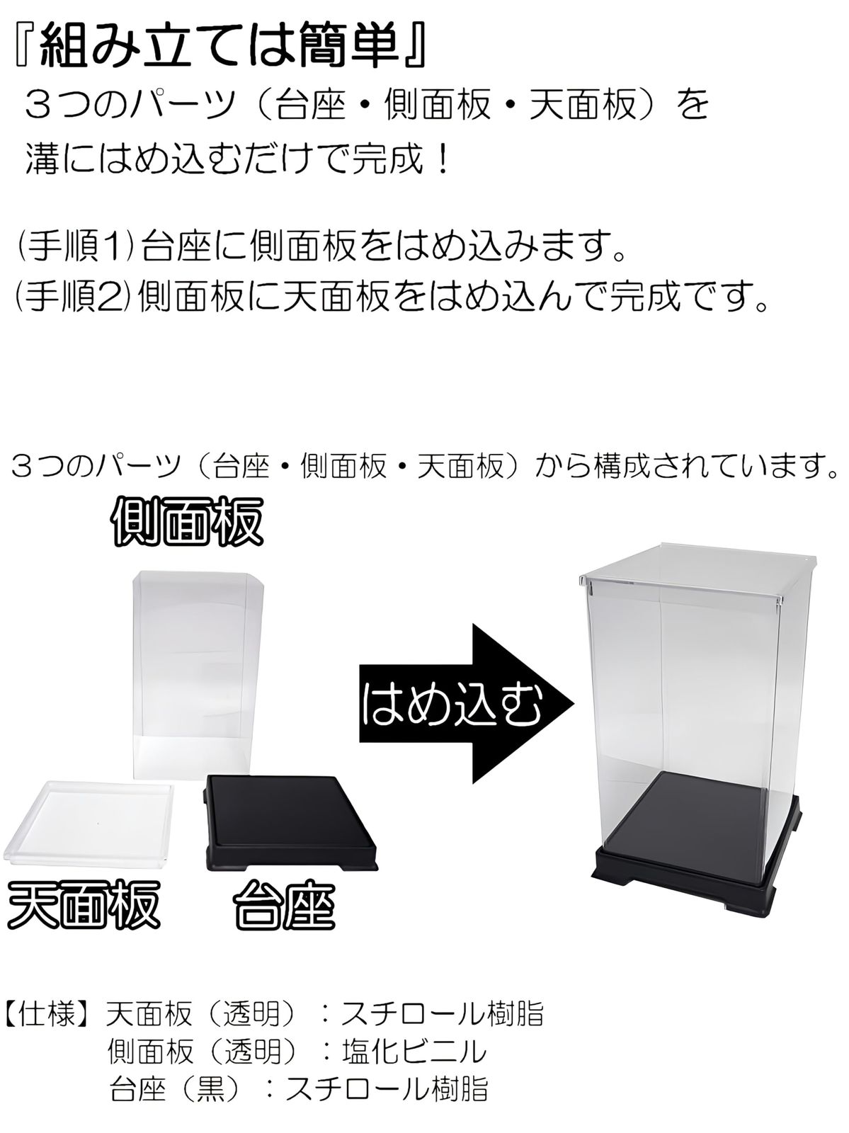 【ケースの仕様】3つのパーツ「1.天面板(透明)はプラスチック(スチロール樹脂:厚さ1mm)、2.側面板(透明)はプラスチックシート(塩化ビニル:厚さ約0.35mm) 、3.台座(黒色)はプラスチック(スチロール樹脂:厚さ1mm)」となっております。側面板(透明)はプラスチックシート(軟質)となっており、手で曲げれば曲がりますのでガラスに比べて軽くて割れにくく地震などで落下してもガラスより安全です。天板と台座は暑さ1mmのプラスチック(硬質)で硬くしっかりしております。天面板(透明)、台座(黒色)は金型に素材を流し込む丸い跡や金型からパーツを抜く際にできる型キズが入ります。ご了承ください。