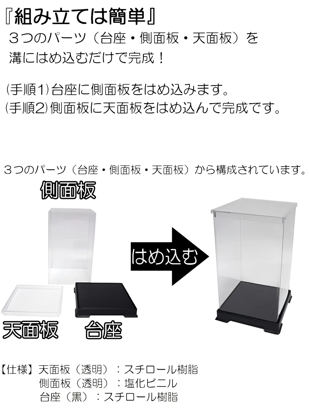 【簡単組み立て】3つのパーツ「1.天面板(透明)、2.側面板(透明)、3.台座(黒色)」を溝にはめ込むだけで完成です。手順1.台座の溝に側面板を広げて、はめ込みます。手順2.側面板に天板をはめ込んで完成です。天板にも溝があるので、溝に沿って側面板をはめ込みます。