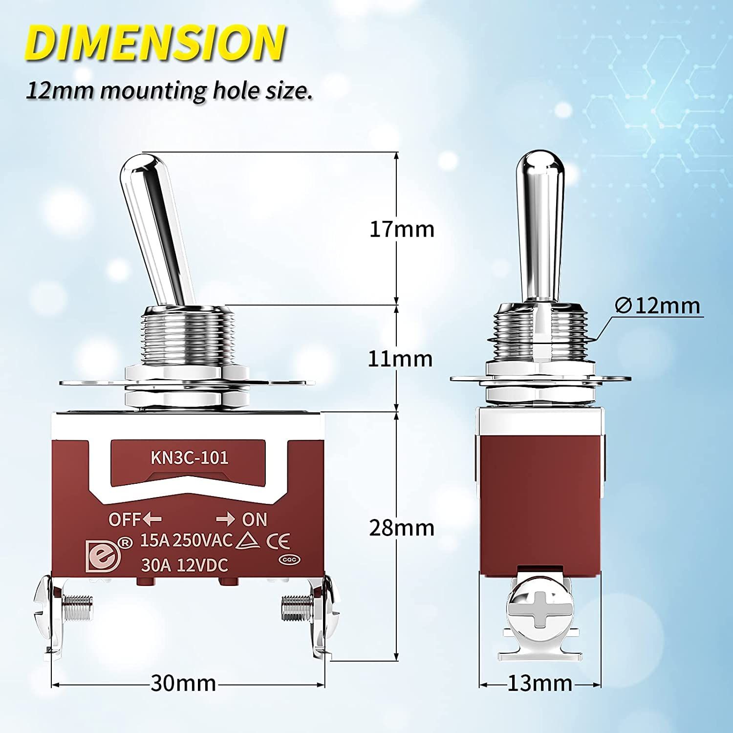 取り付け穴のサイズ: この 12 ボルト トグル スイッチの取り付け穴のサイズは 12mm (0.47 インチ) です。