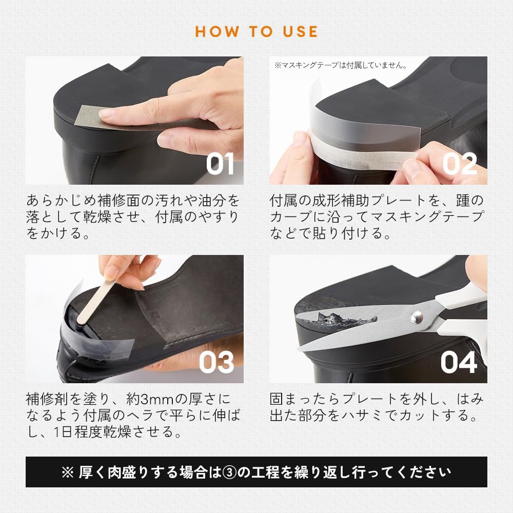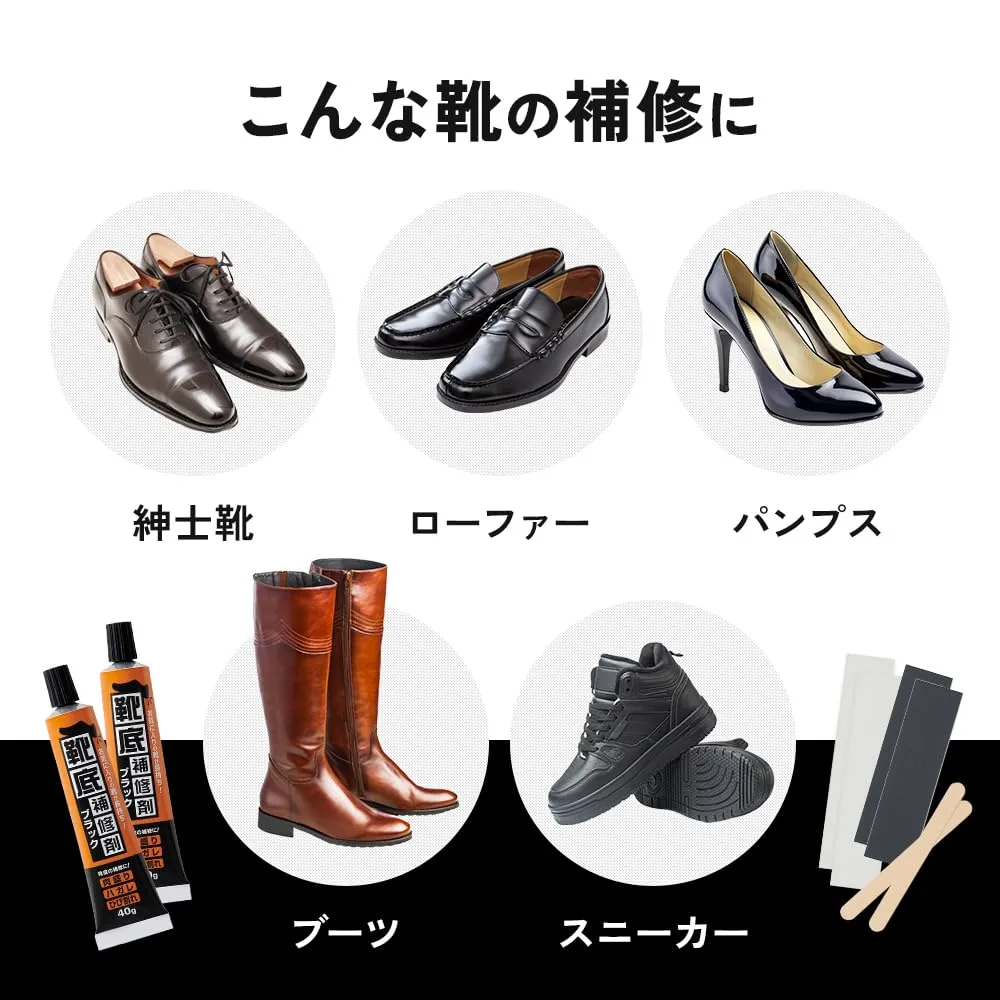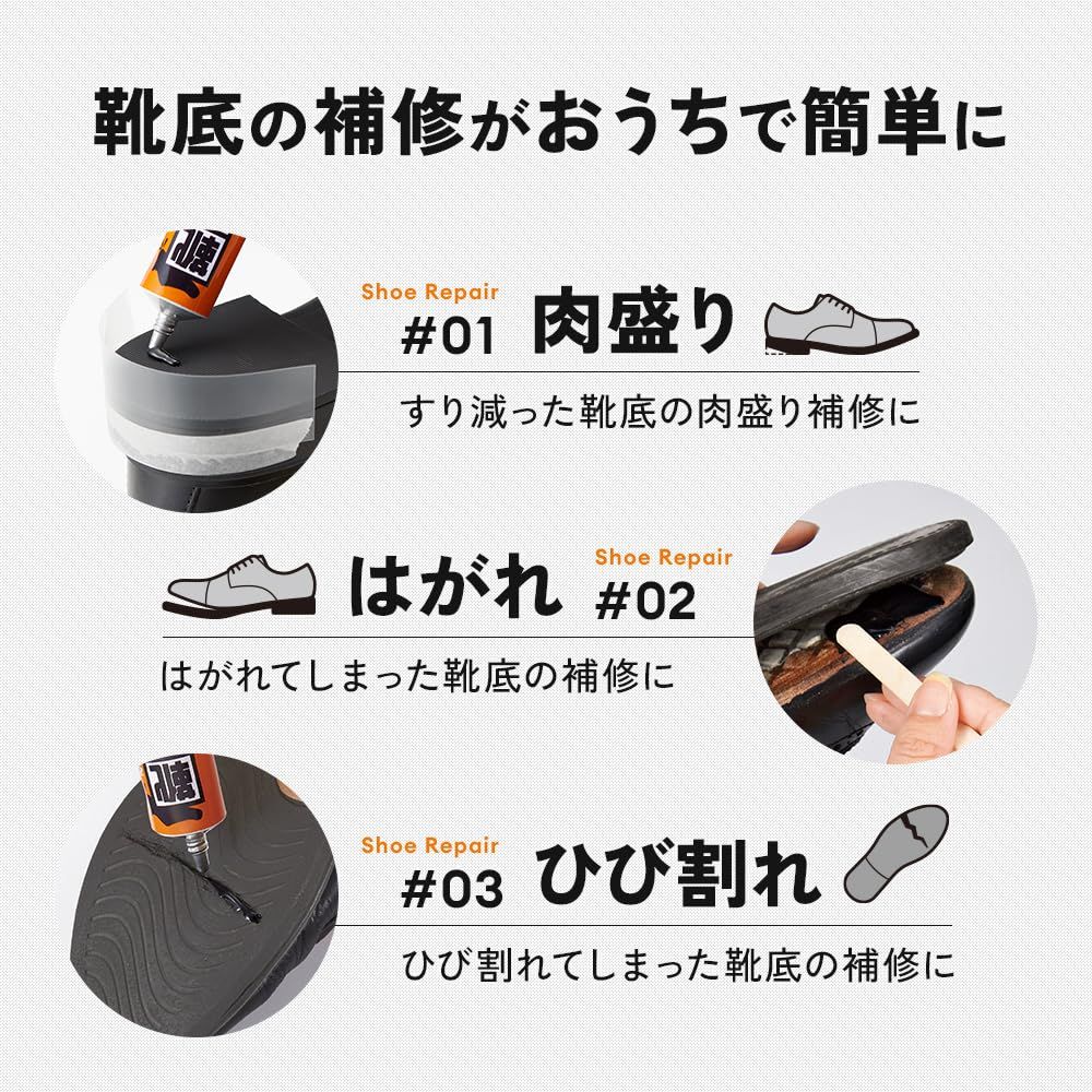 靴底のすり減り・ハガレ・ヒビ割れをおうちで簡単に補修できる靴底補修剤。補修に必要なやすり・成形補助プレート・ヘラ付きで、買ってすぐに補修できて、お気に入りの靴が長持ちします。先細チューブでヒールなどにも使いやすく、40gずつの小分けで無駄なく使えてストックにも便利!