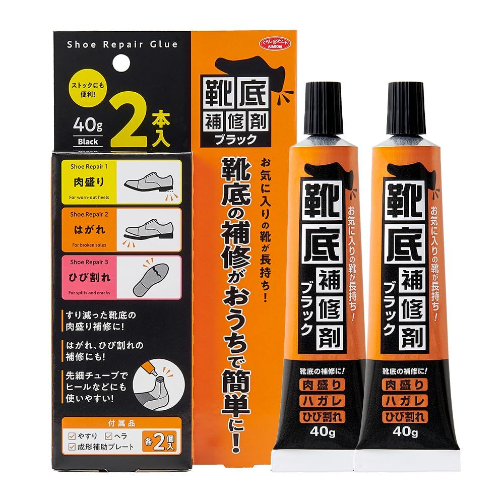アイメディア(Aimedia) 靴底補修剤 40g×2 小分けタイプ ブラック ビジネスシューズ 革靴 かかと すり減り 修理 接着 肉盛り はがれ ひび割れ ゴム底 DIY用 補修材セット