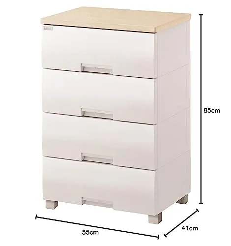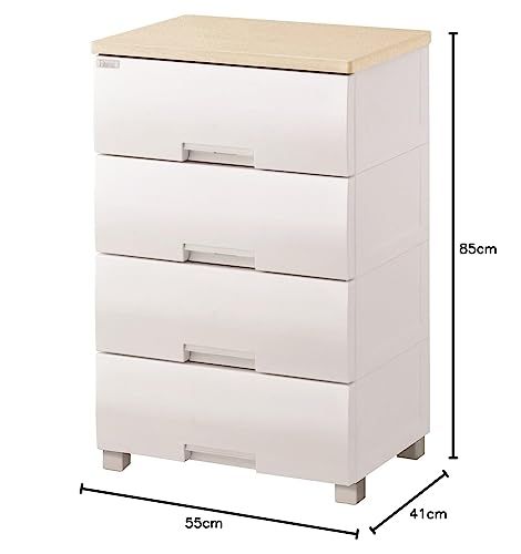 最大外寸(約):幅55奥行41高さ85cm 有効内寸(約):幅47.2奥行34.5高さ15cm(4段) 収納の目安(約):各引出しにトレーナーなら8枚、セーターなら5枚、Yシャツなら8枚 引出耐荷重(約):4kg 天板耐荷重(約):20Kg 材質: