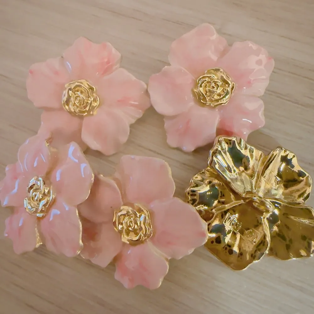 上品で春らしいデザインのフラワーボタンです。 淡いピンクの花びらに、中央のゴールドのバラがアクセントになった華やかなデザインです。 22mmと存在感のあるサイズなので、カーディガンやジャケットの付け替え、バッグのデコレーション、ハンドメイドアクセサリーのパーツとしてもおすすめです。