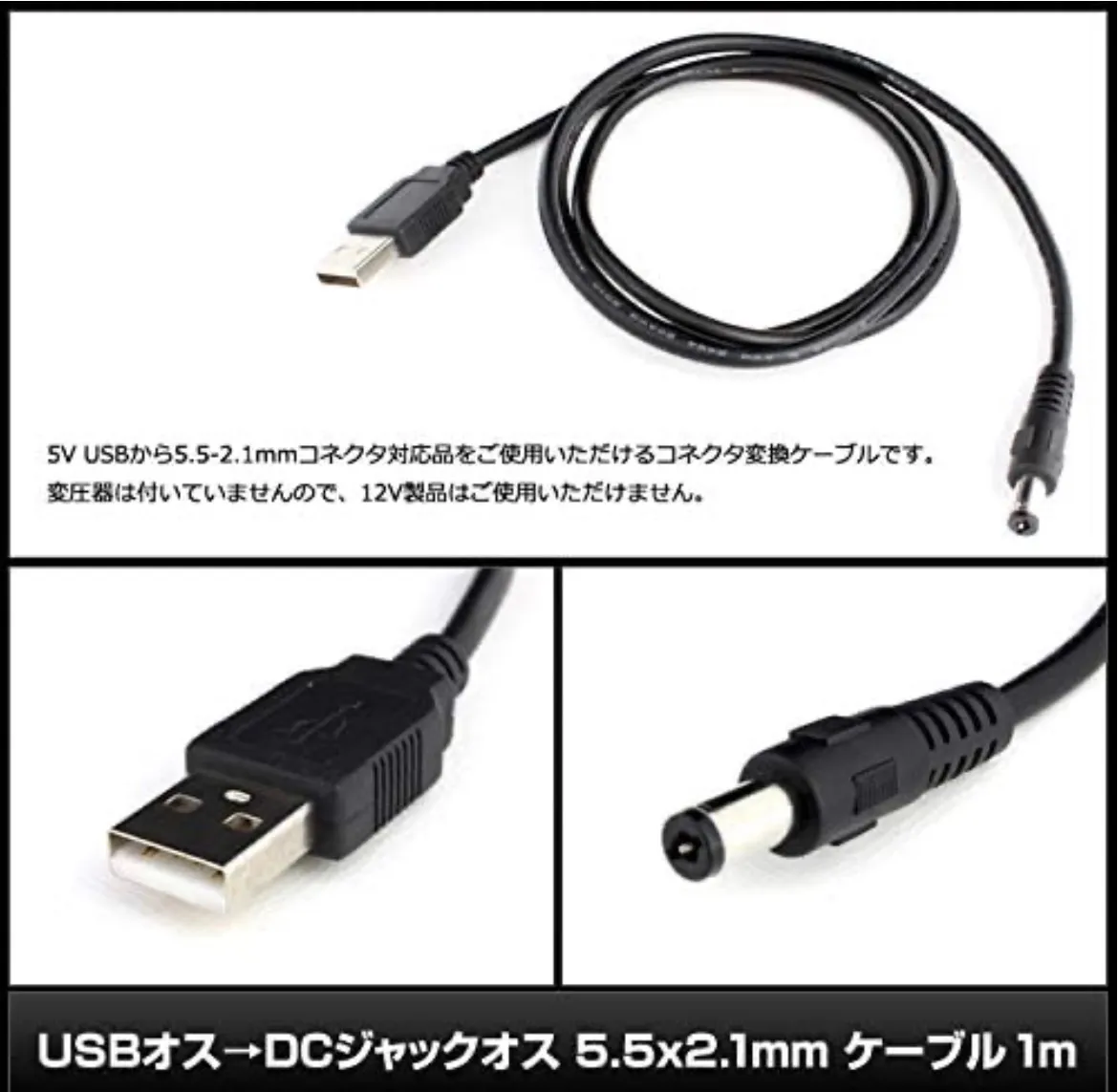Amazonのアウトレット品(アウトレットの為微細な傷や汚れはある可能性ございます) 開封後、中身の確認のみ 5V USBから5.5-2.1mmコネクタ対応品をご使用いただけるコネクタ変換ケーブルです。 変圧器は付いていません。(5V USB給電専用です) 全長:約1m DCジャック:5.5x2.1mm対応 全ての規格に対応する製品ではありません。必ずコネクタサイズをご確認の上ご購入ください。