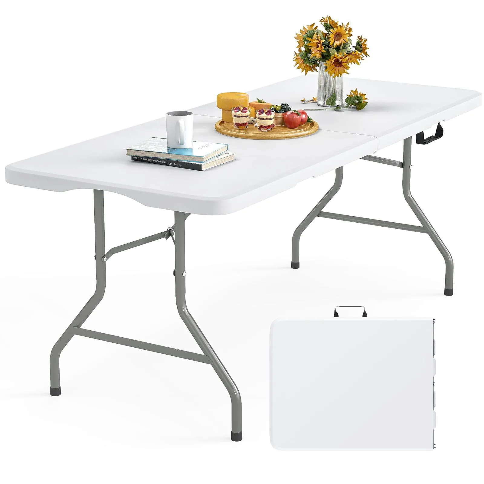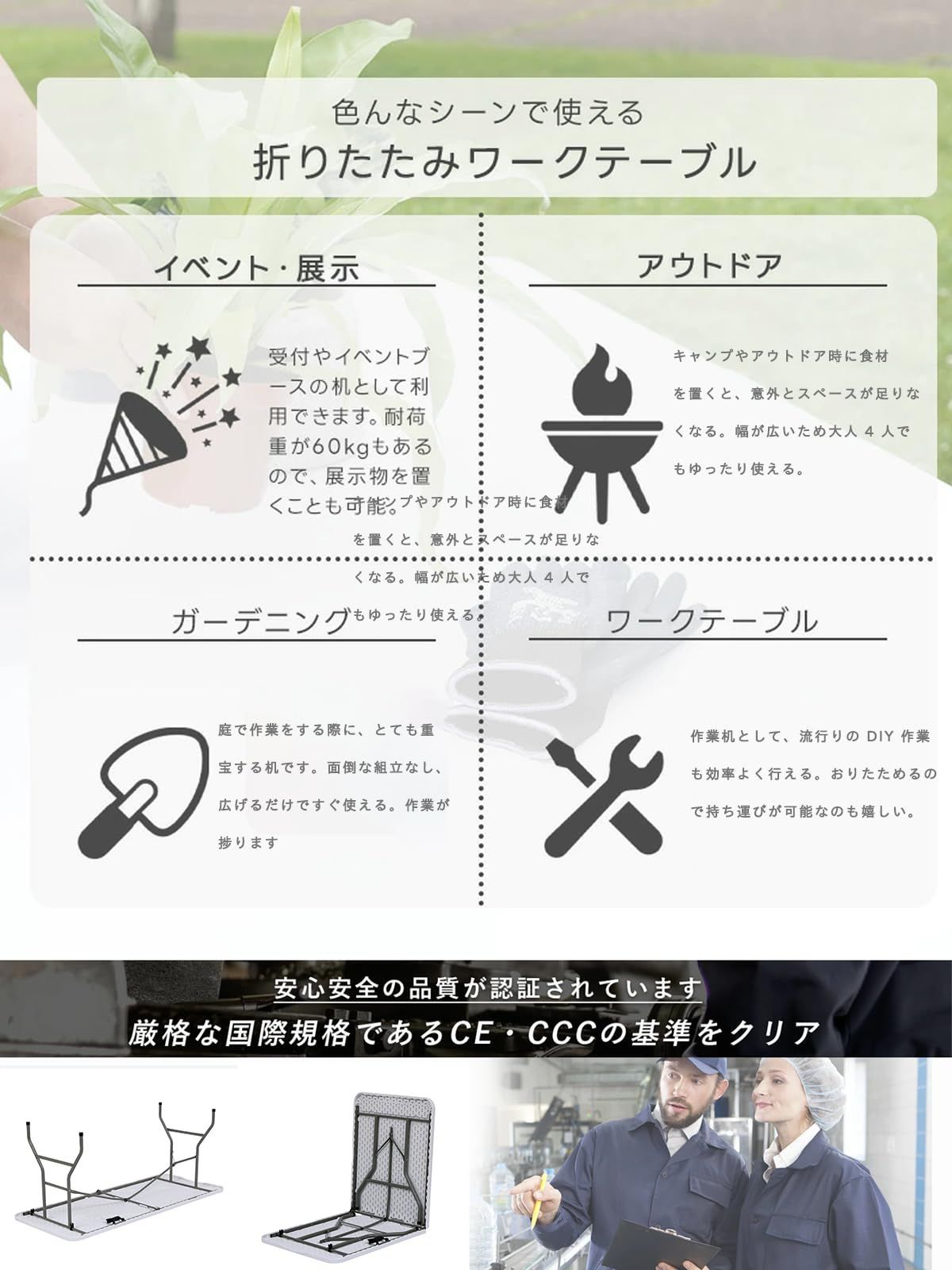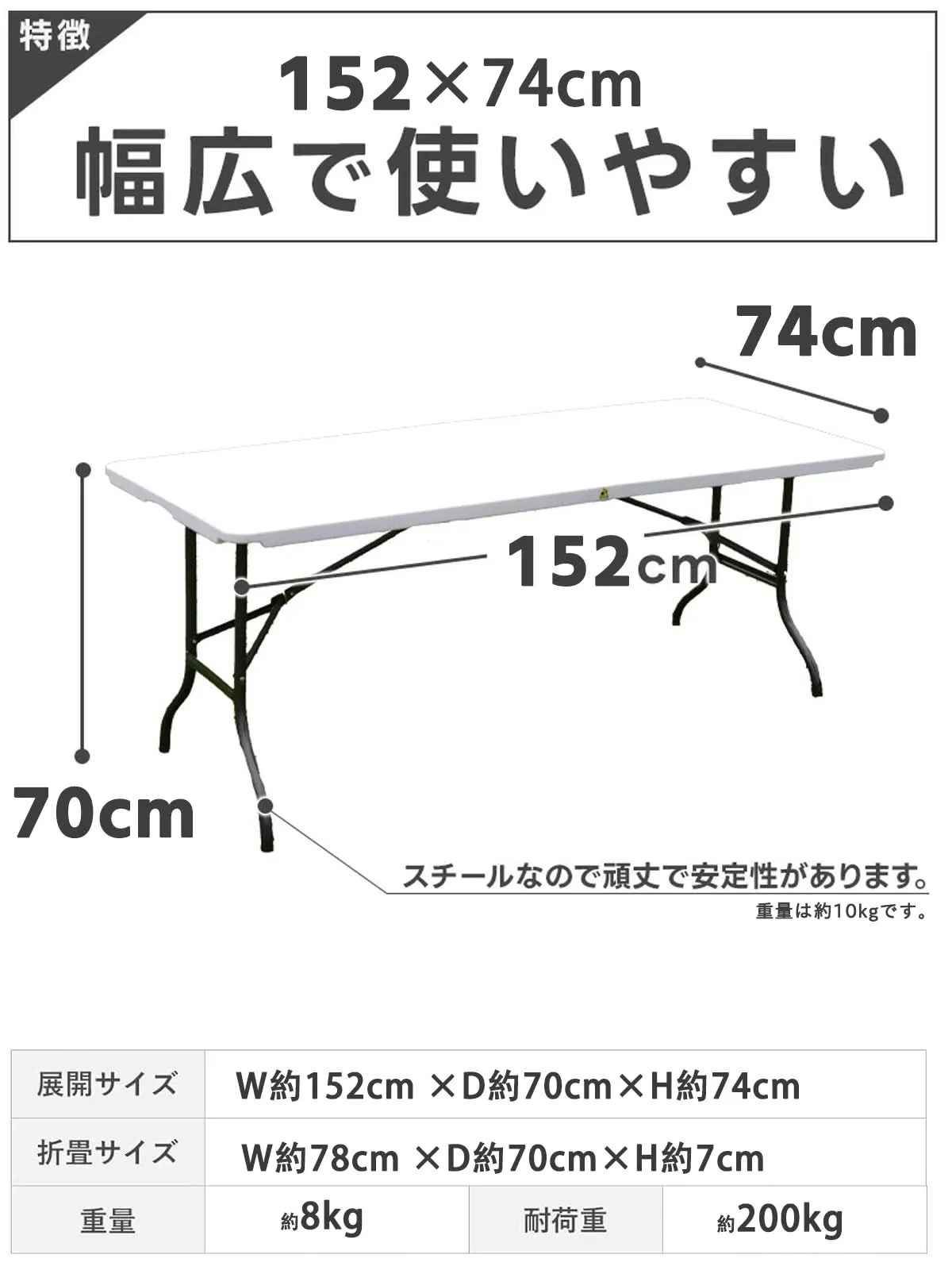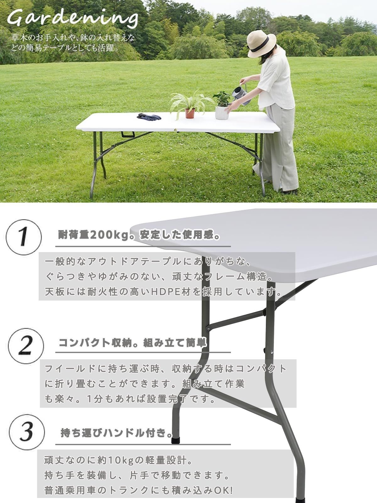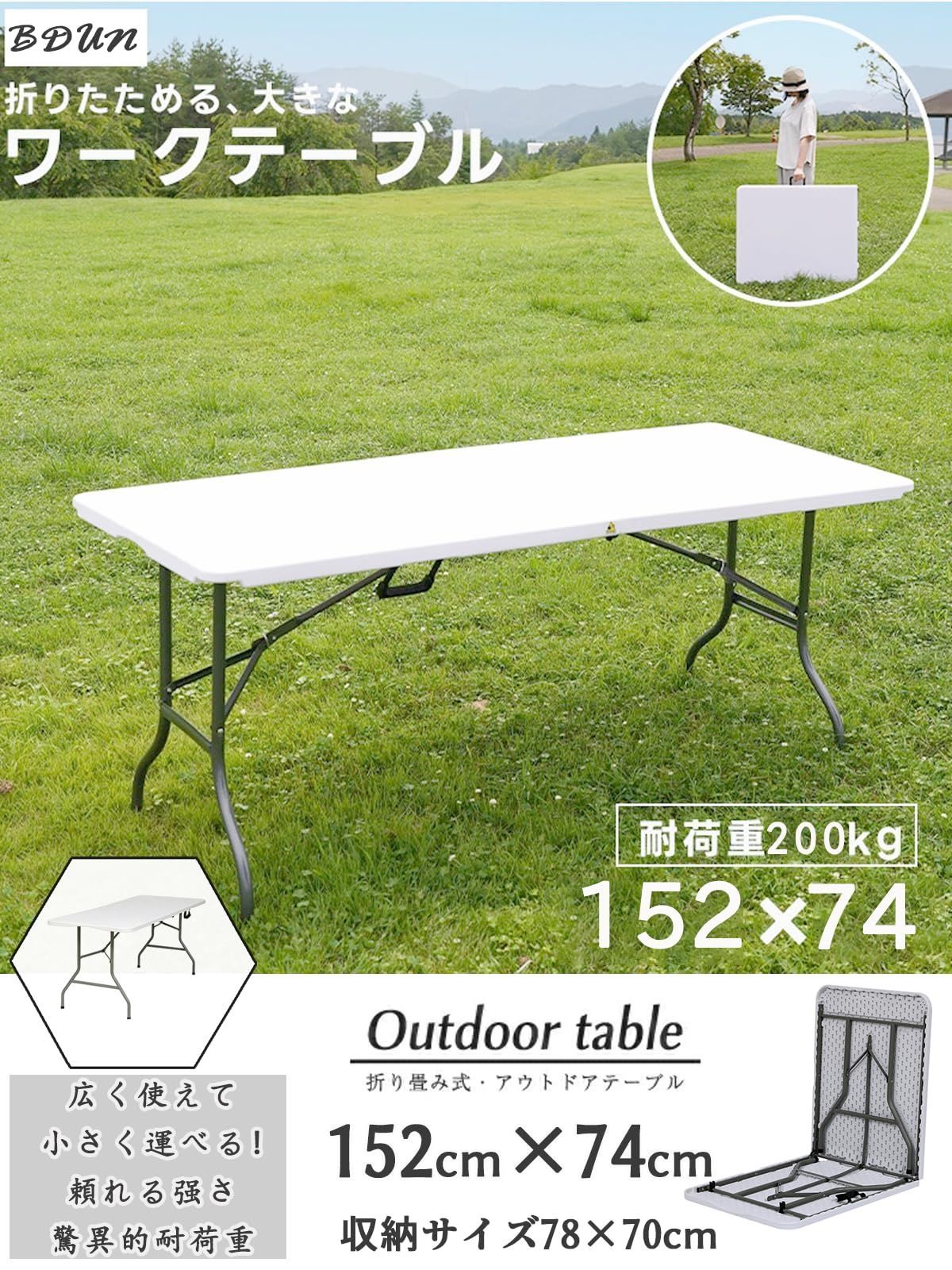 設計の組立不要 折り畳みテーブル 長机 耐荷重200kg キャンプ テーブル ワーク アウトドアテーブル 折りたたみ机 ガーデニング デスク 作業机 卓 ワークベンチ 宅配 ピクニック レジャー マルシェ用 DIY 法人 軽量 屋外 屋内 業務用 作業台 (ホワイト, S(152cm×74cm×70cm)