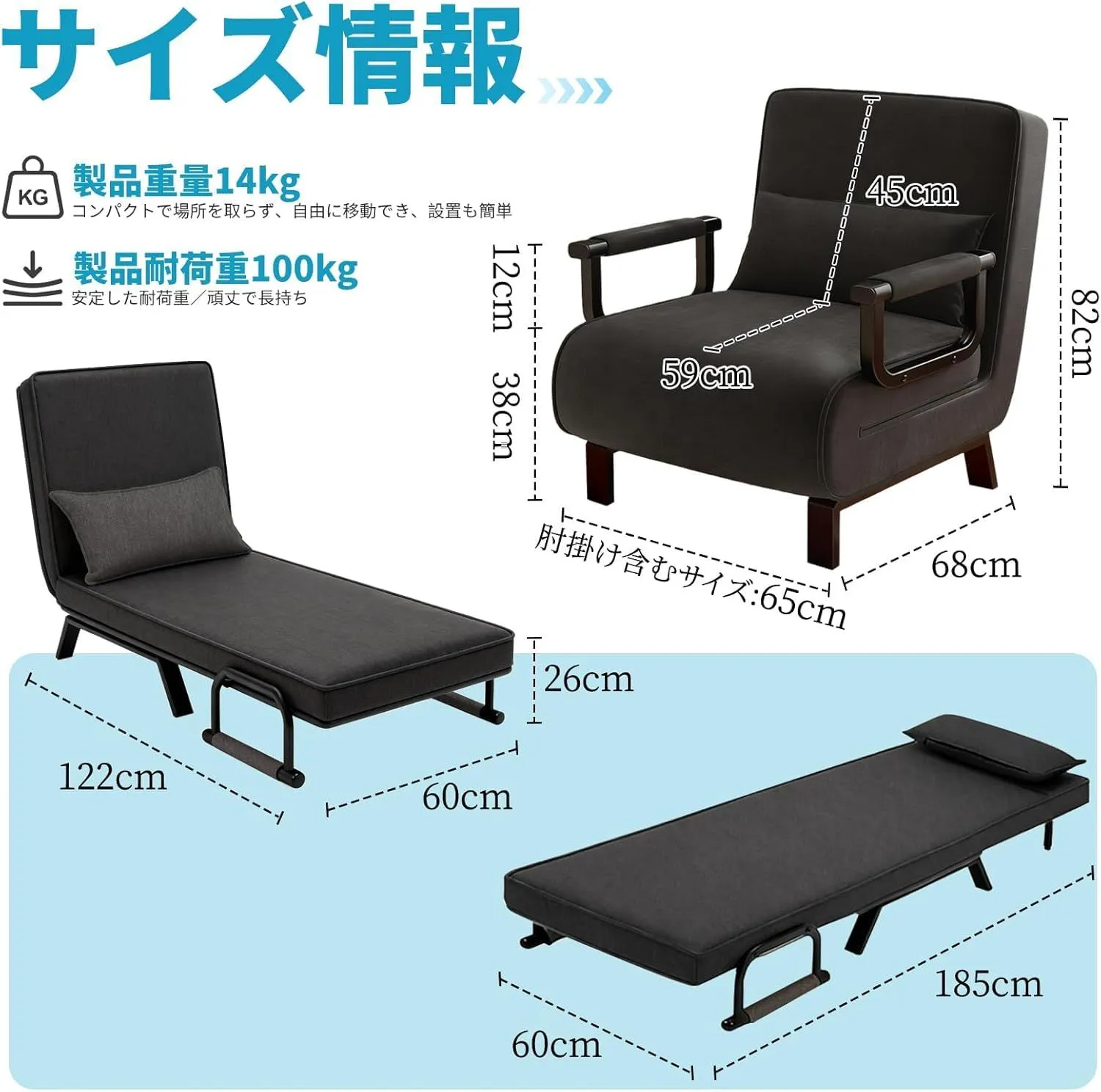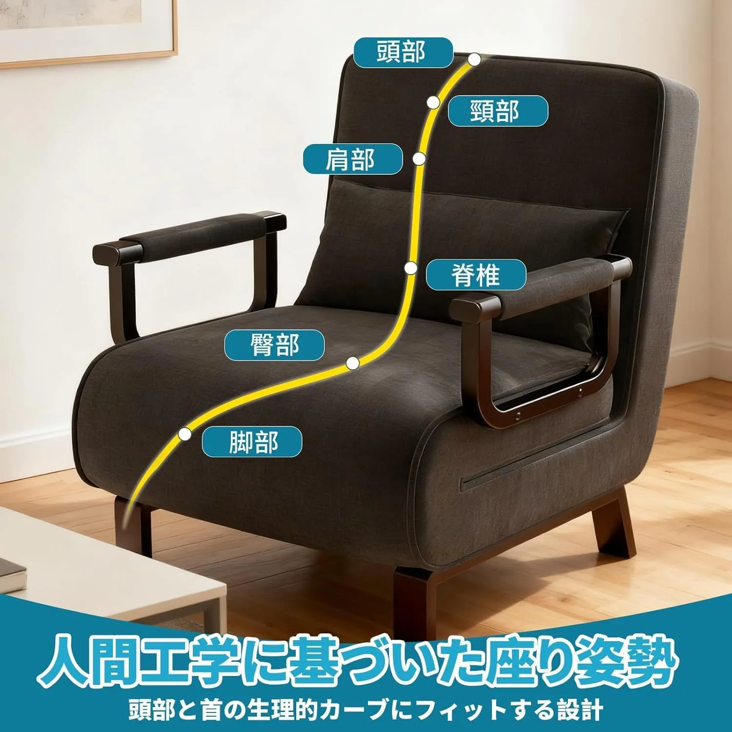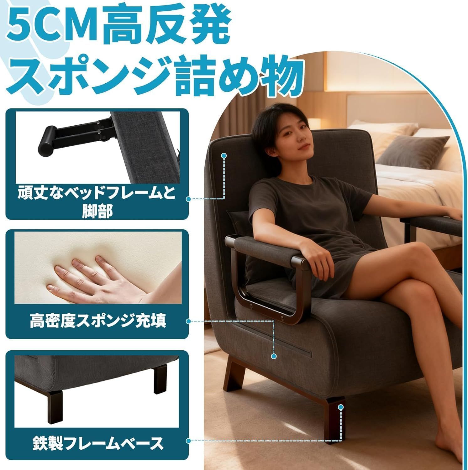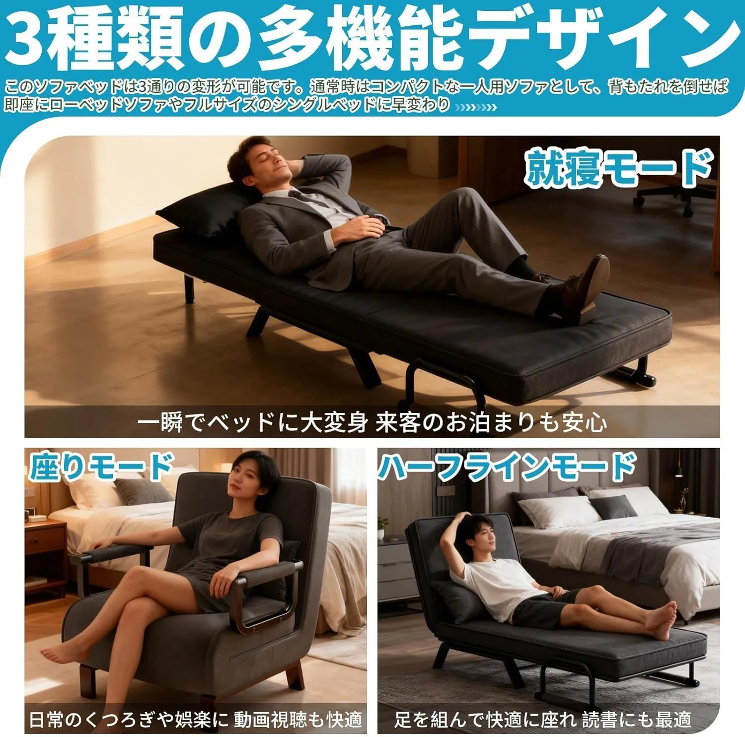 本製品はソファ・ソファベッド・リクライニングチェアの3通りの使い方が可能。シンプルなデザインでありながら多機能で、限られた居住空間にも最適です。
