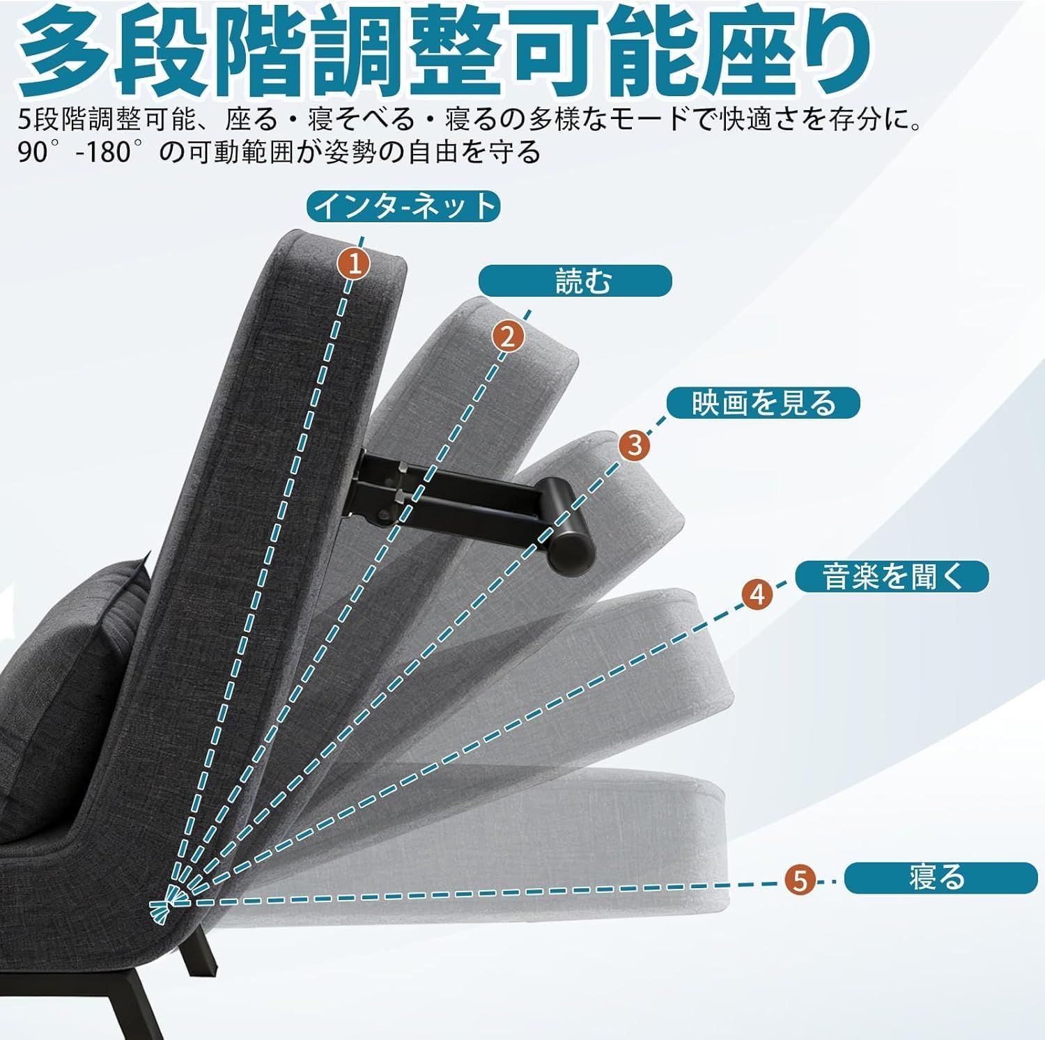 【5段階調整可能な快適リクライニング】90度から180度まで5段階に調整可能なリクライニング機能は、この商品の最大の特長。デスクワーク時は直立姿勢で、休憩時は適度に倒して、就寝時は完全フラットに。人間工学に基づいた角度設計で、長時間使用しても背中や腰への負担が少なく、理想的な姿勢をキープできます。