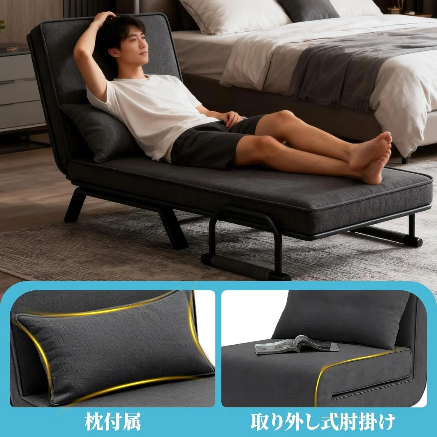 【省スペース設計の折りたたみ機能】使用しない時は簡単に折りたたんで収納可能なため、ワンルームや限られた居住空間にもぴったり。同色調のクッションが付属しており、背中のフィット感を高めるだけでなく、枕代わりにもなるなど機能性も抜群。折りたたんだ状態でもスリムで、必要な時にサッと展開できる利便性が特徴です。