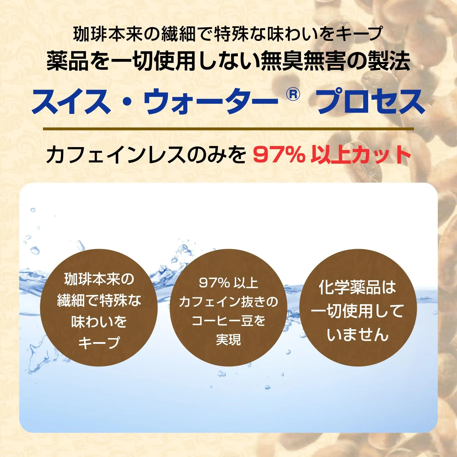【特徴】カフェイン抜きでも安心の美味しさ。薬品を一切使用しない無臭無害の製法「スイス・ウォーター(R)プロセス」でカフェインのみを97%以上カット。コーヒー本来の繊細で独特な味わいをキープ。