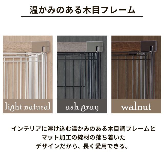 商品紹介お部屋になじむ上質なデザイン。インテリアに合わせて3色から選べる木目調のウッディサークルです。インテリアに溶け込む温かみのある木目調なので、落ち着いたカラーで長く愛用できます。スムーズな開閉ができるスライドドアは右側・左側どちら側にも設置可能です。四隅にピンを差し込むだけで組み立て完了。トレーは水拭きはもちろん、水で丸洗いできます。幅・高さ・奥行が違う豊富なサイズバリエーション。わんちゃんの大きさや性格に合わせて選べます。別売りの屋根を付けることで、留守番時などのペットの飛び出しを防止します。★お客様組み立て★使用方法お部屋になじむ上質なデザイン。インテリアに合わせて3色から選べる木目調のウッディサークルです。インテリアに溶け込む温かみのある木目調なので、落ち着いたカラーで長く愛用できます。スムーズな開閉ができるスライドドアは右側・左側どちら側にも設置可能です。四隅にピンを差し込むだけで組み立て完了。トレーは水拭きはもちろん、水で丸洗いできます。幅・高さ・奥行が違う豊富なサイズバリエーション。わんちゃんの大きさや性格に合わせて選べます。別売りの屋根を付けることで、留守番時などのペットの飛び出しを防止します。★お客様組み立て★