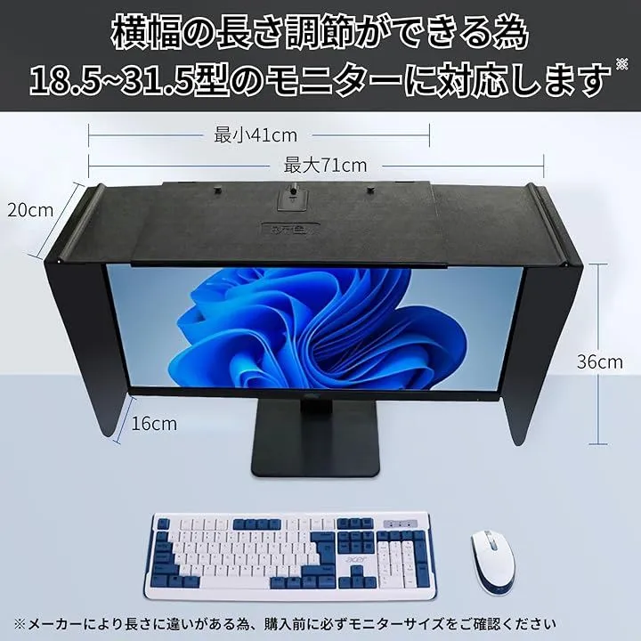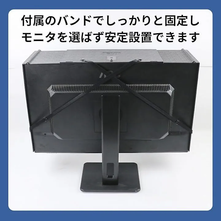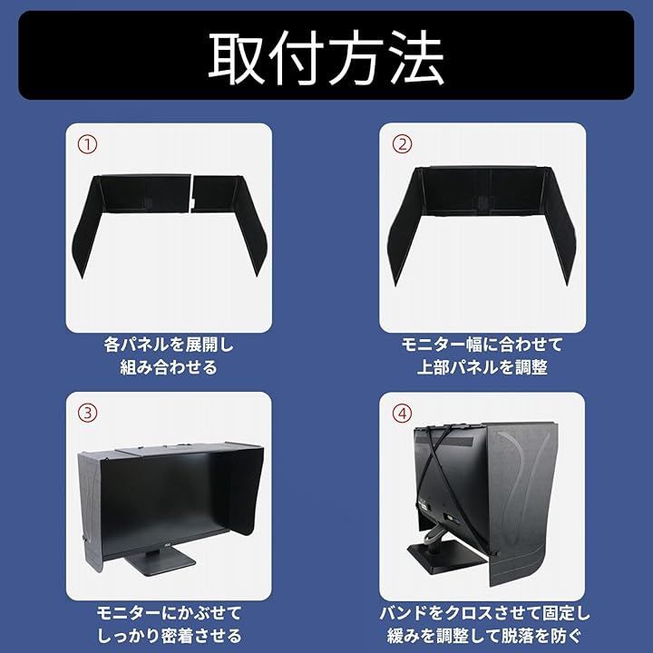 工具や接着剤は一切不要で、付属の調節可能な固定バンドをモニター背面に十字にかけるだけで誰でも簡単にしっかりと固定できるサンシェードです。