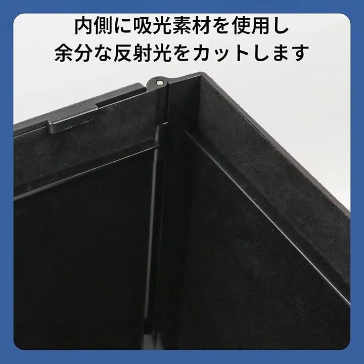 写真現像や映像のカラーグレーディングなど、シビアな色校正作業を強力にサポートする理想的な日除け環境を構築するモニターカバーです。