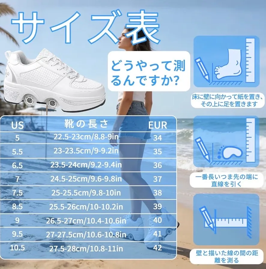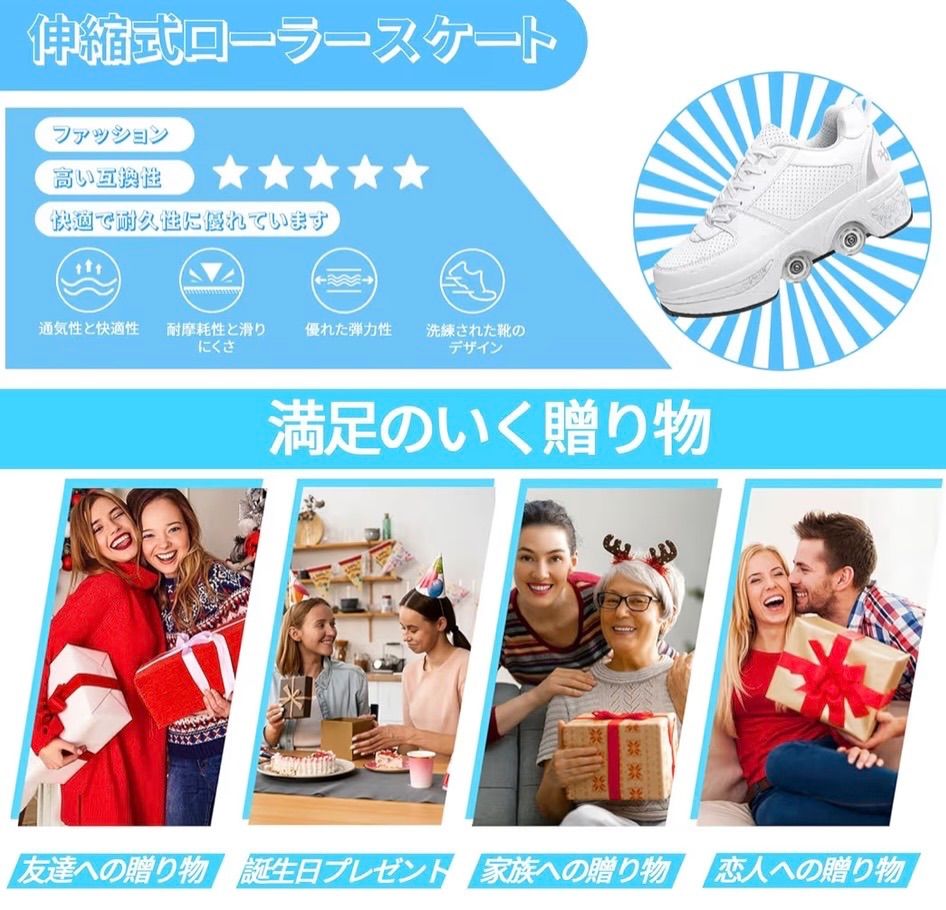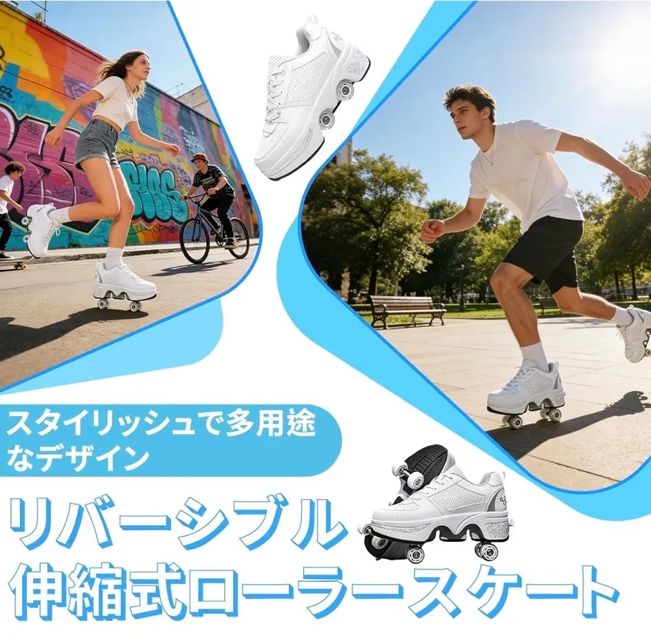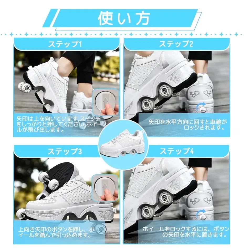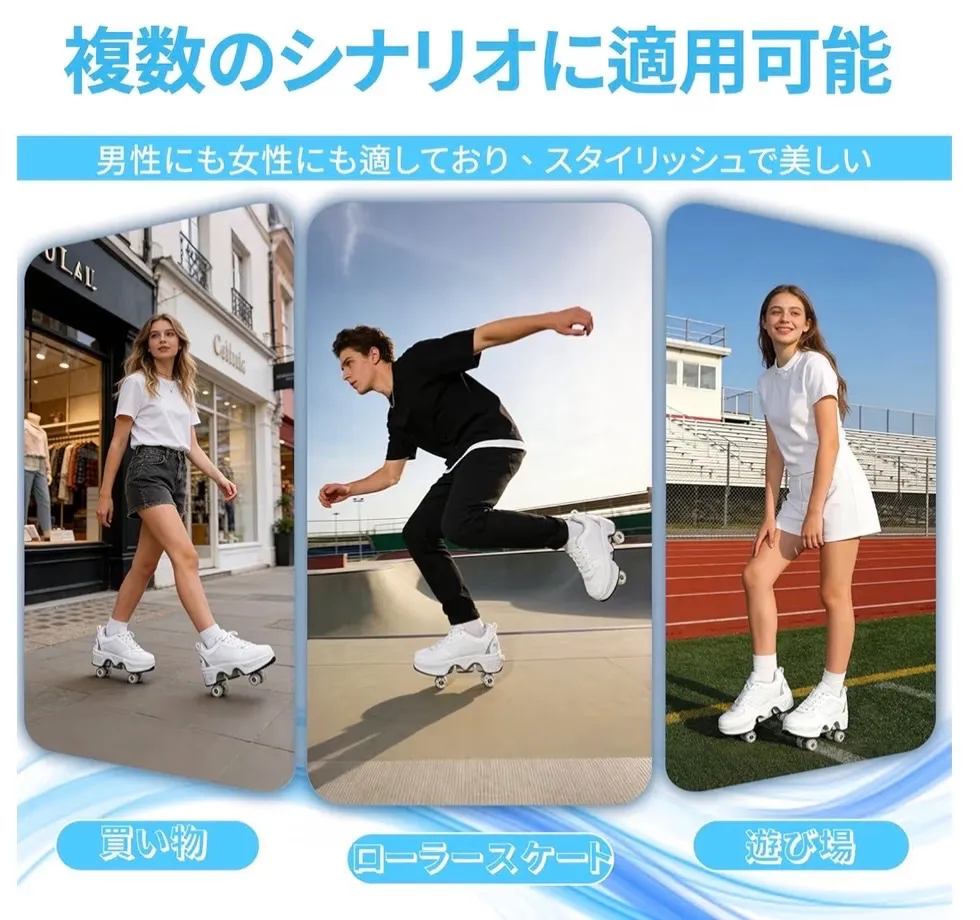 【多機能二列変形ホイール】ハイキング、スケート、スポーツなどの機能も充実。ローラースケートはマイクロファイバー製、ソールはラバー製、ホイールはPU製。