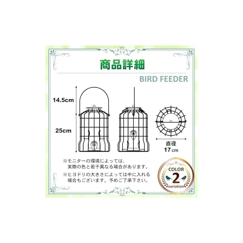 【商品説明】 バードフィーダー ヒヨドリよけ えさ台:庭でゆっくりと野鳥観察は楽しいですが、ヒヨドリに邪魔されるのは困りますよね。そんなお悩みに、ヒヨドリ対策をした、小鳥だけにエサを提供する野鳥の餌台が登場です。黒と緑の2個セットです。 一般的な鳥の餌台を設置しても、ヒヨドリが大きな声でやってきては騒ぎ立て、他の小鳥たちが近寄れない、という経験はありませんか?ヒヨドリをどうにかしたい。そんな悩みを解決するのがこのバードフィーダーです。 防護柵付きでヒヨドリ侵入を防ぎ、小鳥たちの安心空間を実現。約3cmの格子で、小鳥が快適に食事を楽しめる設計。エサ補充も簡単。メジロ、シジュウカラ、ヤマガラなど、小鳥たちが安全に食事を楽しめるます。 サイズとカラー:25cm(底から取手まで)、取手14.5cm x 幅17cm ブラックとグリーンの2色 ※モニターの環境によっては、実際の色と若干異なる場合があります。※ヒヨドリの大きさによっては中に入れる場合もございます。 推奨事項:容器を清潔に保つため定期的な掃除。穀物をたくさん入れすぎると詰まる原因になります。エサの上は屋根付きですが、大雨等の場合水の侵入で餌が腐る場合もございます。設置は雨で濡れない所がおすすめです。