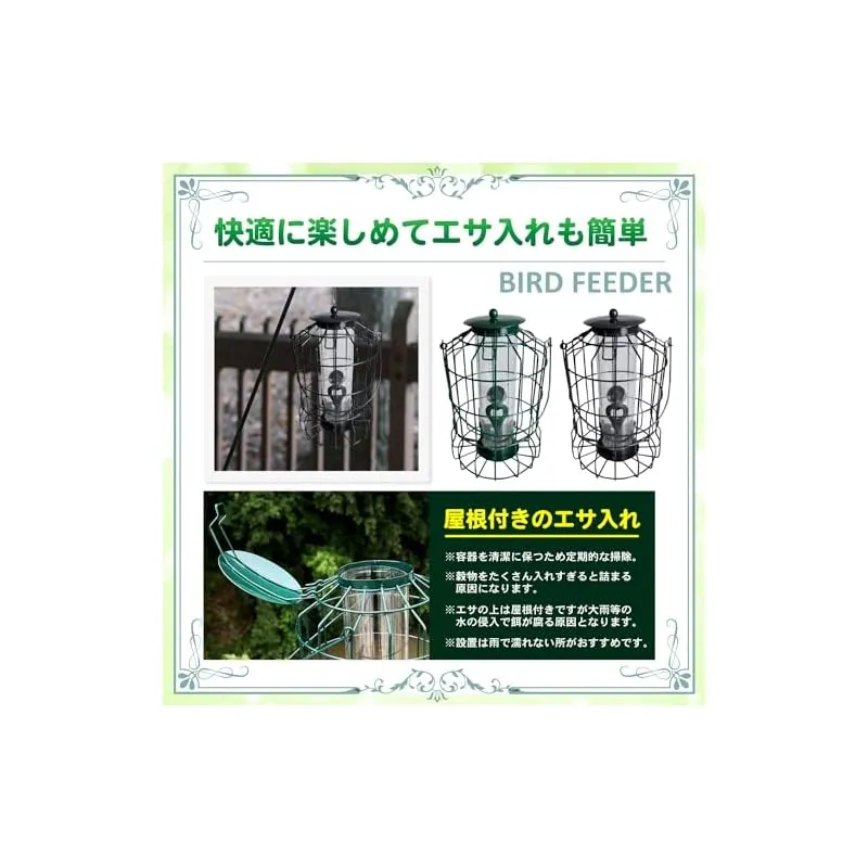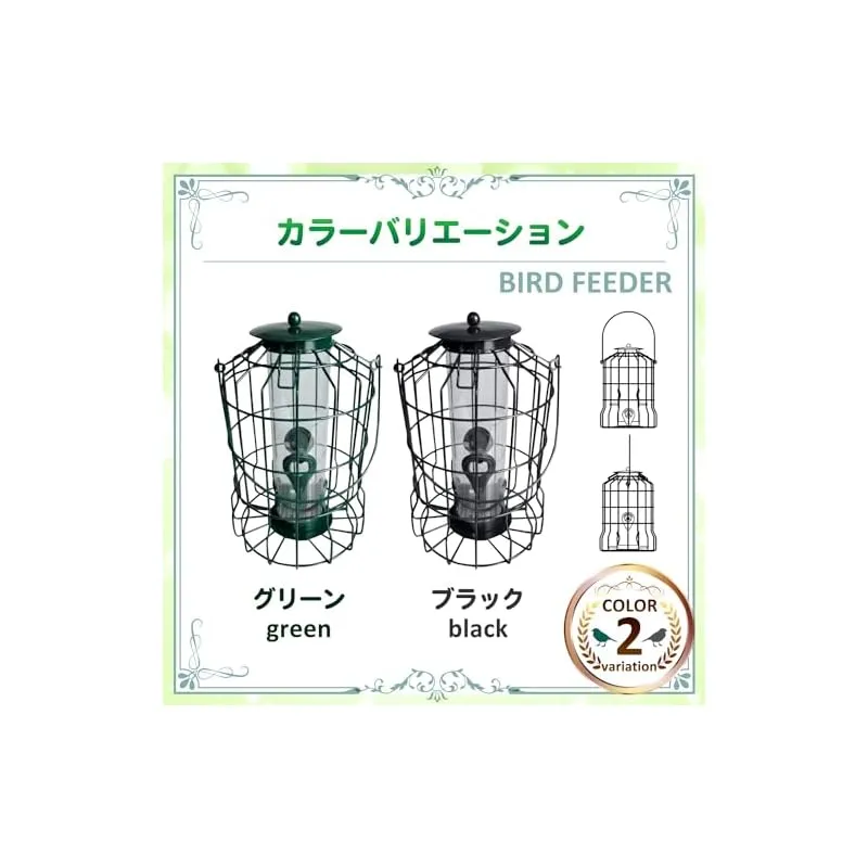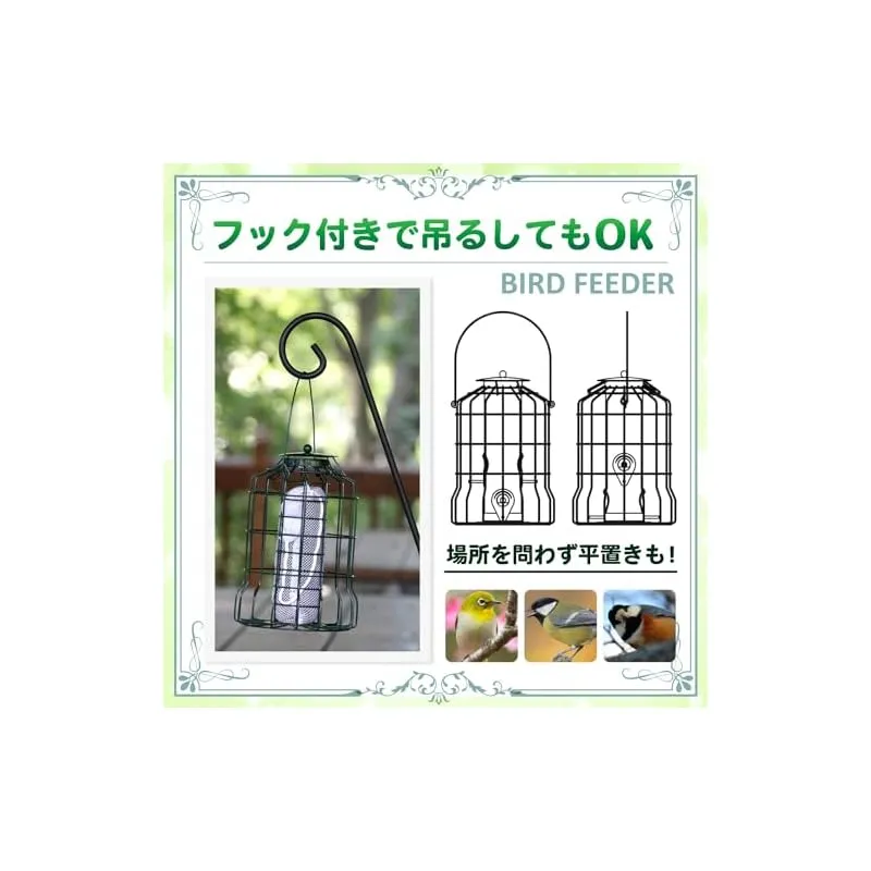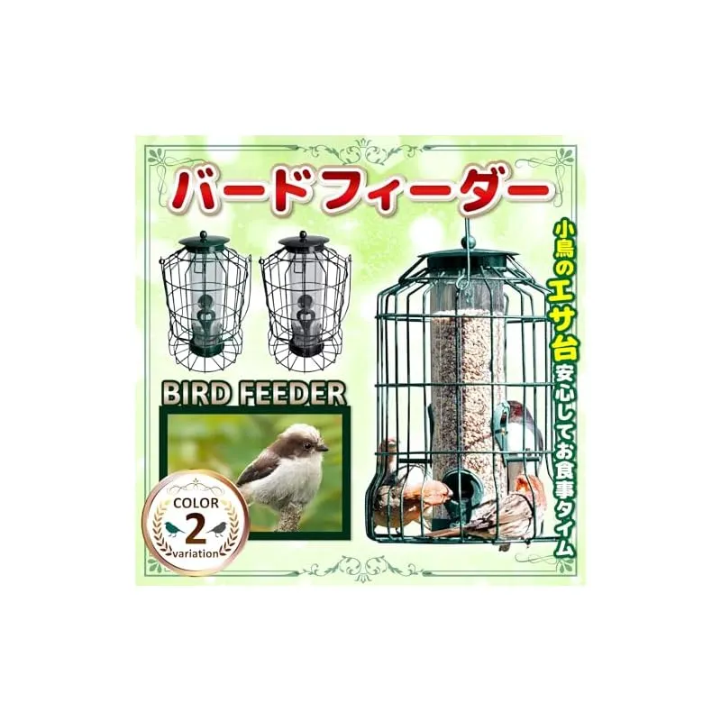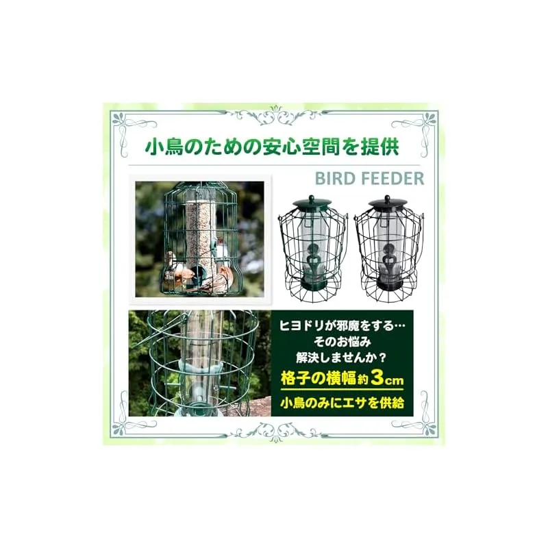 【商品概要】 バードフィーダー ヒヨドリよけ えさ台:庭でゆっくりと野鳥観察は楽しいですが、ヒヨドリに邪魔されるのは困りますよね。そんなお悩みに、ヒヨドリ対策をした、小鳥だけにエサを提供する野鳥の餌台が登場です。緑のエサ台です。 一般的な鳥の餌台を設置しても、ヒヨドリが大きな声でやってきては騒ぎ立て、他の小鳥たちが近寄れない、という経験はありませんか?鳥餌台に来るヒヨドリをどうにかしたい。鳥のエサがみんな食べられてします。そんな悩みを解決するのがこのバードフィーダーです。こちらは 野鳥 餌入れ 屋外用です。 鳥のえさ台は、防護柵付きでヒヨドリ侵入を防ぎ、小鳥たちの安心空間を実現。約3cmの格子で、小鳥が快適に食事を楽しめる設計。エサ補充も簡単。メジロ、シジュウカラ、ヤマガラなど、小鳥たちが安全に食事を楽しめるバードフィーダー 屋外です。 バードフィーダー オクガイのサイズとカラー:25cm(底から取手まで)、取手14.5cm、幅17cm ブラックとグリーンの2色 ※モニターの環境によっては、実際の色と若干異なる場合があります。※鳥のえさだいは、ヒヨドリの大きさによっては、鳥のえさだいの中に入れる場合もございます。また、ヒヨドリより小さいムクドリの場合も同様となります。 推奨事項:バードフィーダー 吊り下げは、容器を清潔に保つため定期的な掃除。穀物をたくさん入れすぎると詰まる原因になります。エサの上は屋根付きですが、大雨等の場合水の侵入で餌が腐る場合もございます。設置は雨で濡れない所がおすすめです