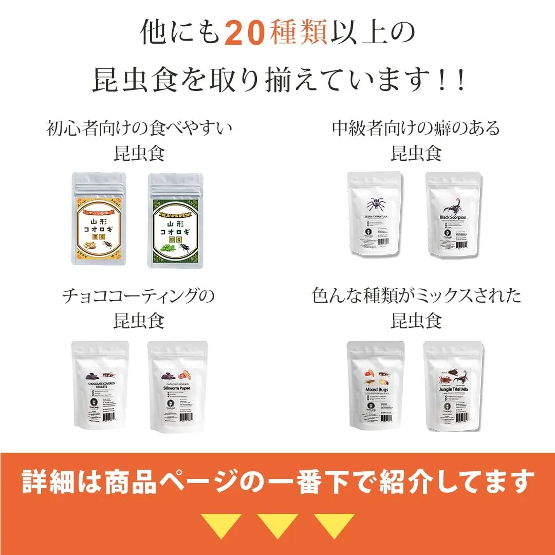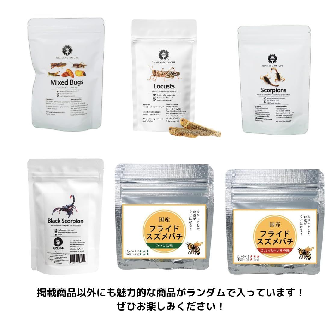 なにが届くかわかりませんが必ず1000円よりお得な商品をお送りします。 昆虫食は:環境負荷に優しい食料で、タンパク質やミネラルも豊富です。昆虫は少なくとも世界80カ国以上、20億人を超える人が今も食用としています。 昆虫食は:国際連合の専門機関の一つ「国際連合食糧農業機関(FAO)」もタンパク源として世界的な人口増加による食糧難対策の一端を担う食文化として評価しています。 本品は価格以上の商品を無作為に選んでおります。性質上複数回購入いただいても同じ商品が届く事や、お客様の想定とは違う商品が届く事がございます。あくまでも商品を選択出来ない分価格もお安くしております。その点をご理解いただいたうえでご購入ください。上記ご理解いただけない場合はトラブルの元となりますのでご購入はお控えください。