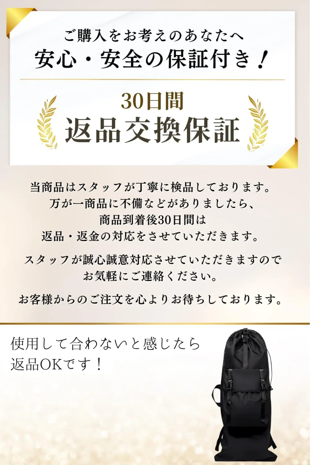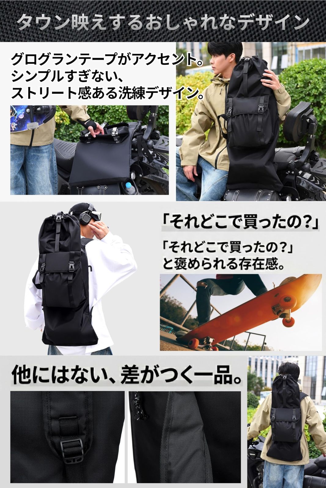 開口部はドローコード(紐)とバックルのダブル固定方式を採用。ボードを素早く、かつ確実にホールドできるため、移動中に中身が動く不安を解消しました。ストリートに馴染む洗練されたデザインも魅力です。