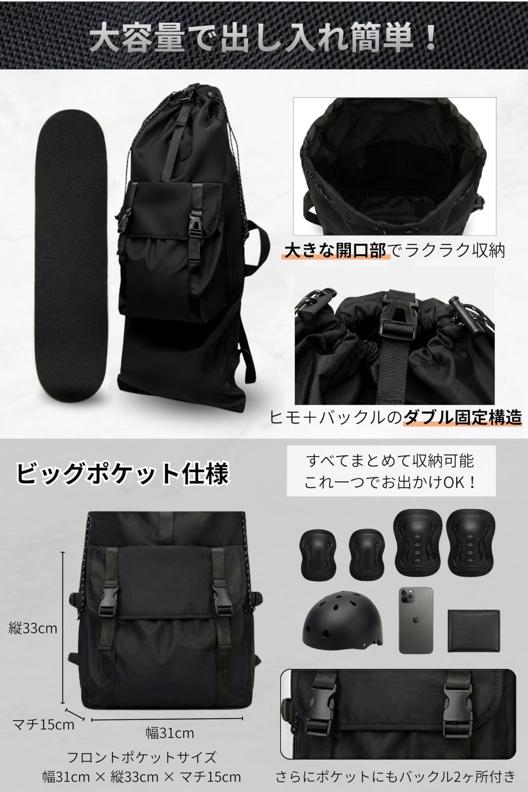 マチ15cm」の超大型ポケットを搭載。ヘルメット、シューズ、プロテクター、工具まで、スケボーに必要なすべての装備をこれ一つに集約して手ぶらで移動可能です。