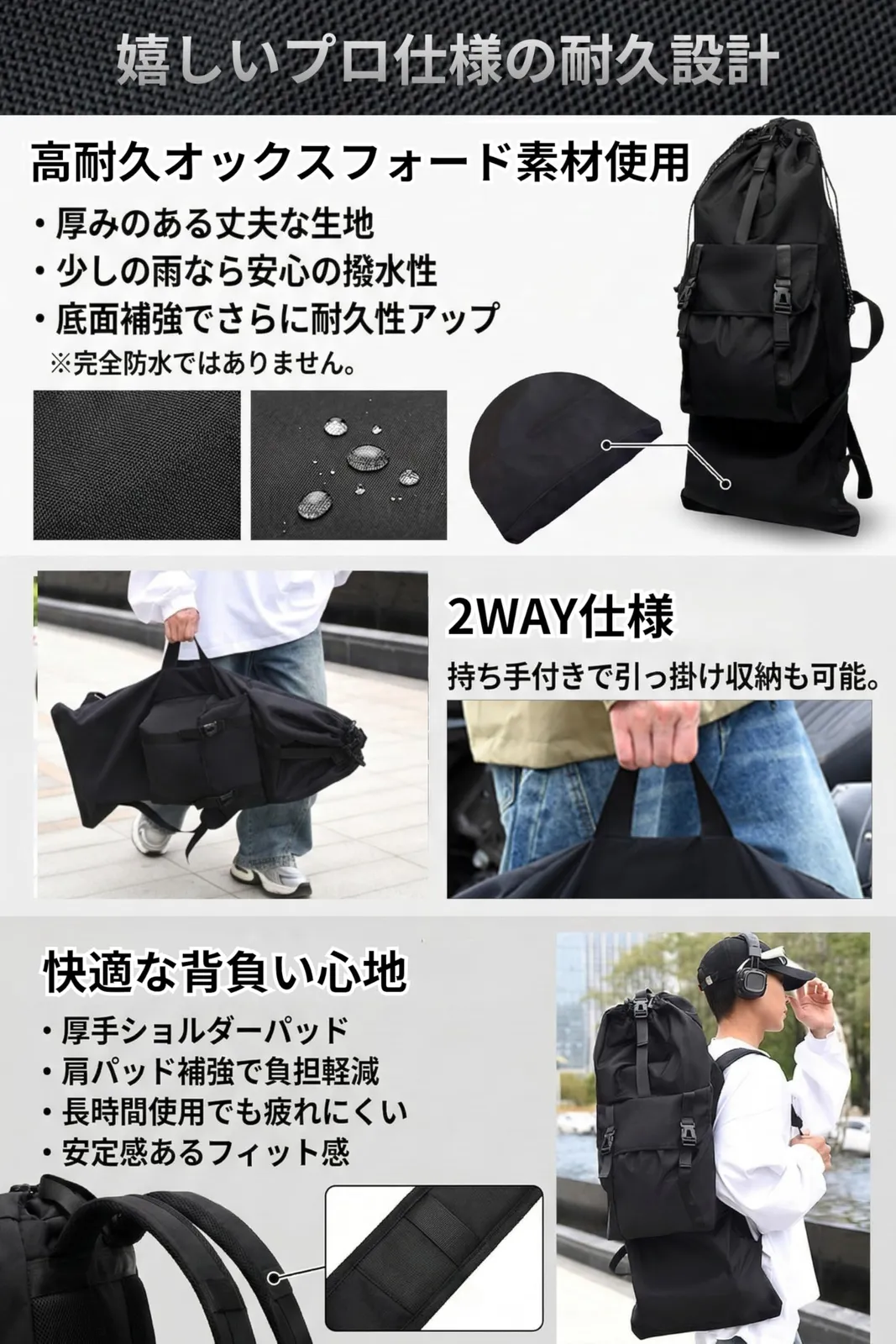 摩耗に強くタフな高密度オックスフォード生地を使用。撥水加工を施しているため、急な雨や路面の泥汚れから大切なボードを守ります。底面は二重補強されており、重量のあるボードでも安心して運べる耐久性です。