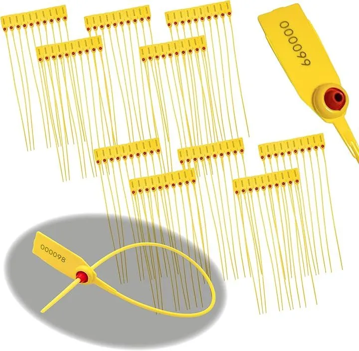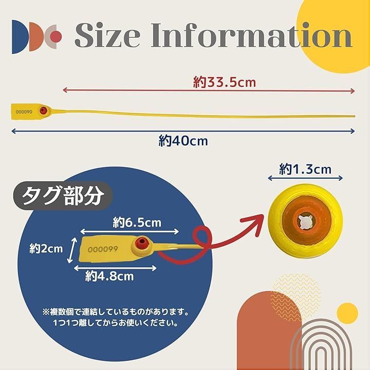 「商品仕様」全長:約400mm,幅:約20mm,ループ部分:約335mm,重さ:1本あたり約3.5g,素材:PP、PE、スチール製ロックシリンダー,セット数:黄色x100本