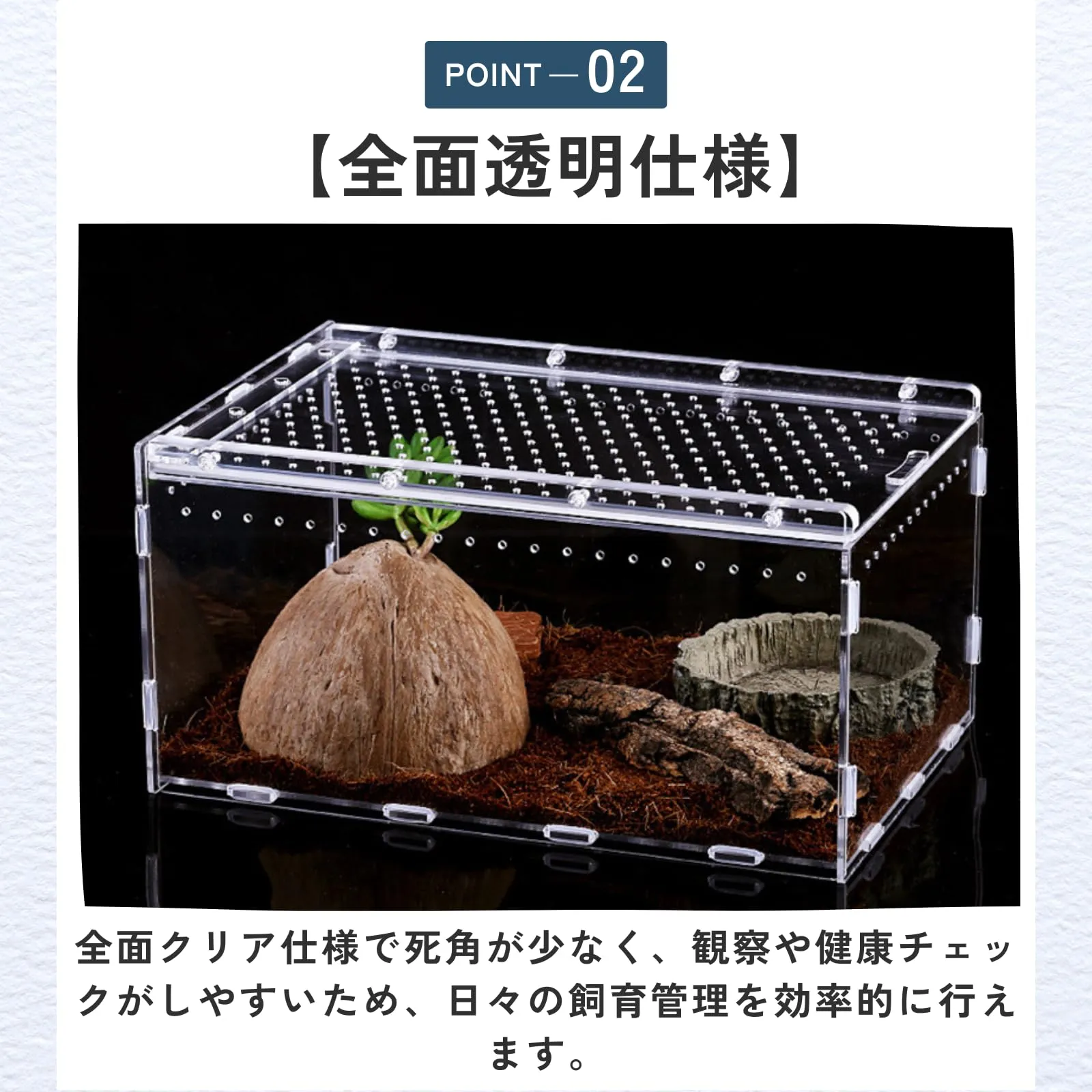 【全面透明仕様】全面クリア仕様で死角が少なく、観察や健康チェックがしやすいため、日々の飼育管理を効率的に行えます。