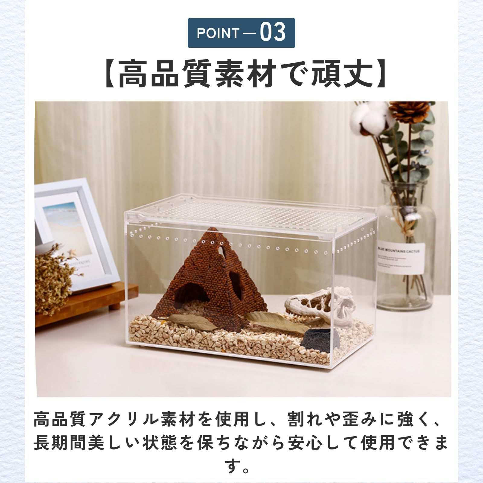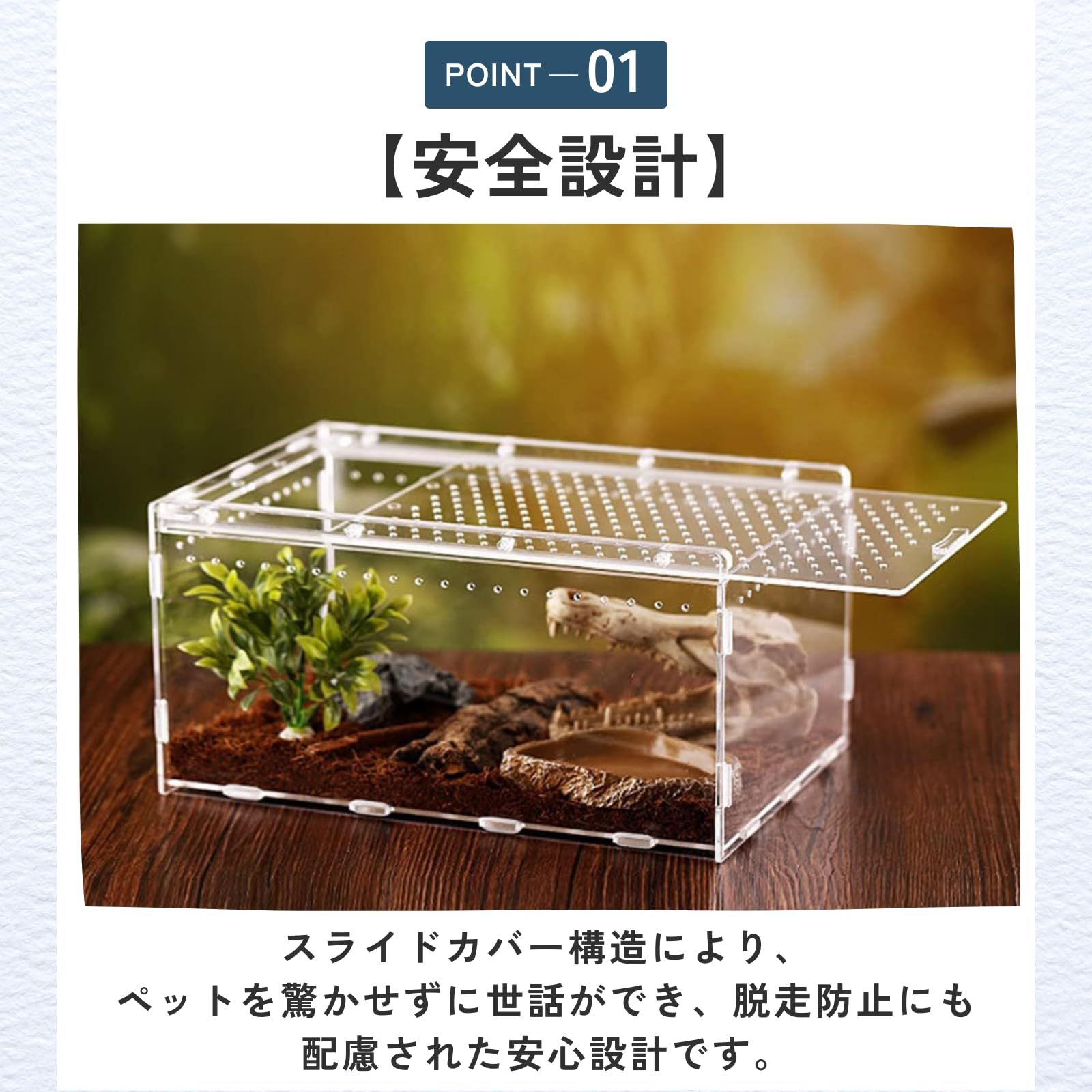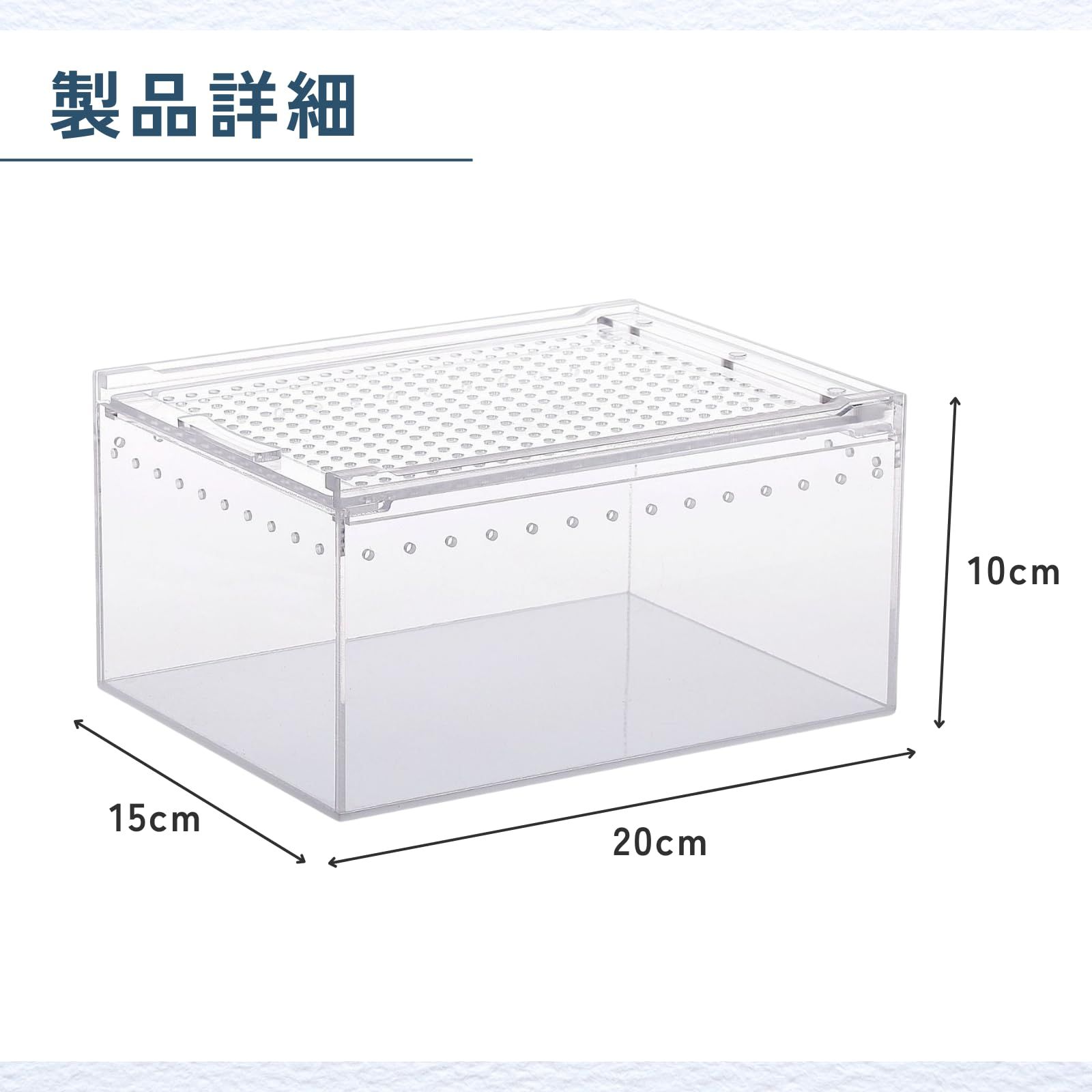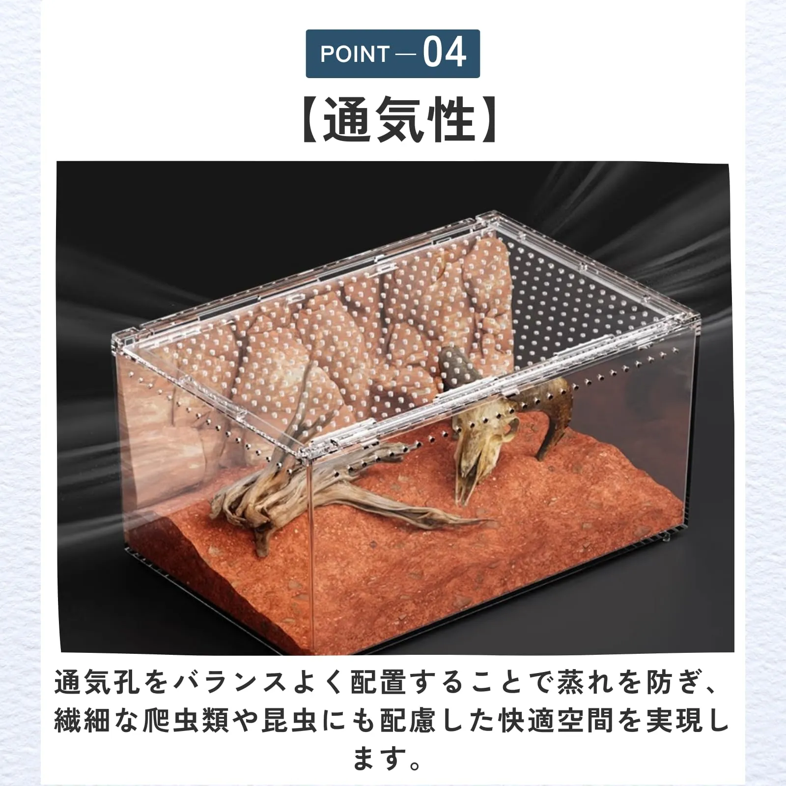 【通気性】通気孔をバランスよく配置することで蒸れを防ぎ、繊細な爬虫類や昆虫にも配慮した快適空間を実現します。