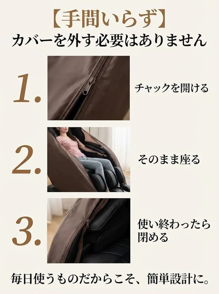 「前開きチャックでスムーズな装着」 マッサージチェアカバーの中でも珍しい「前開きチャック」付きのデザインで、カバー全体を外す手間をかけずに、チャックを開けるだけでいつでもチェアを使用可能です。