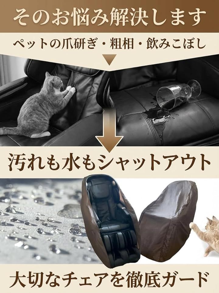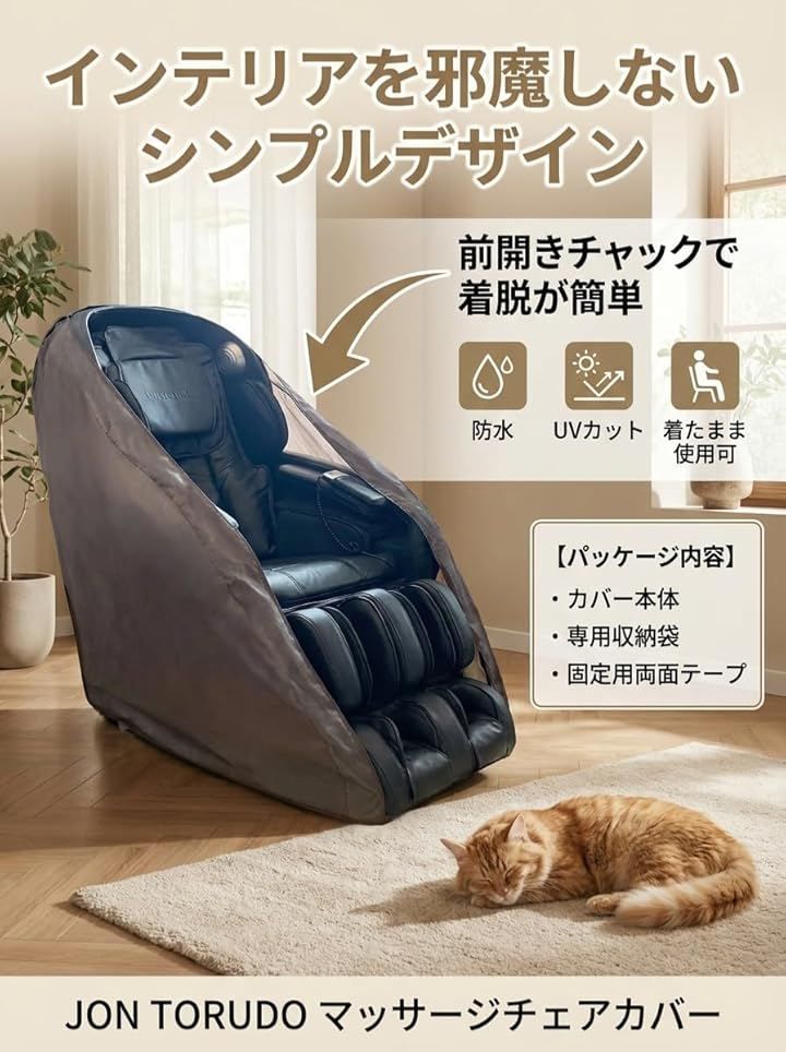 JON TORUDO マッサージチェアカバーは、カバーを外さずに前開きチャックで簡単に使える設計で、ペットや飲み物のこぼれ、日焼けによる劣化から大切なチェアをしっかり守ります。