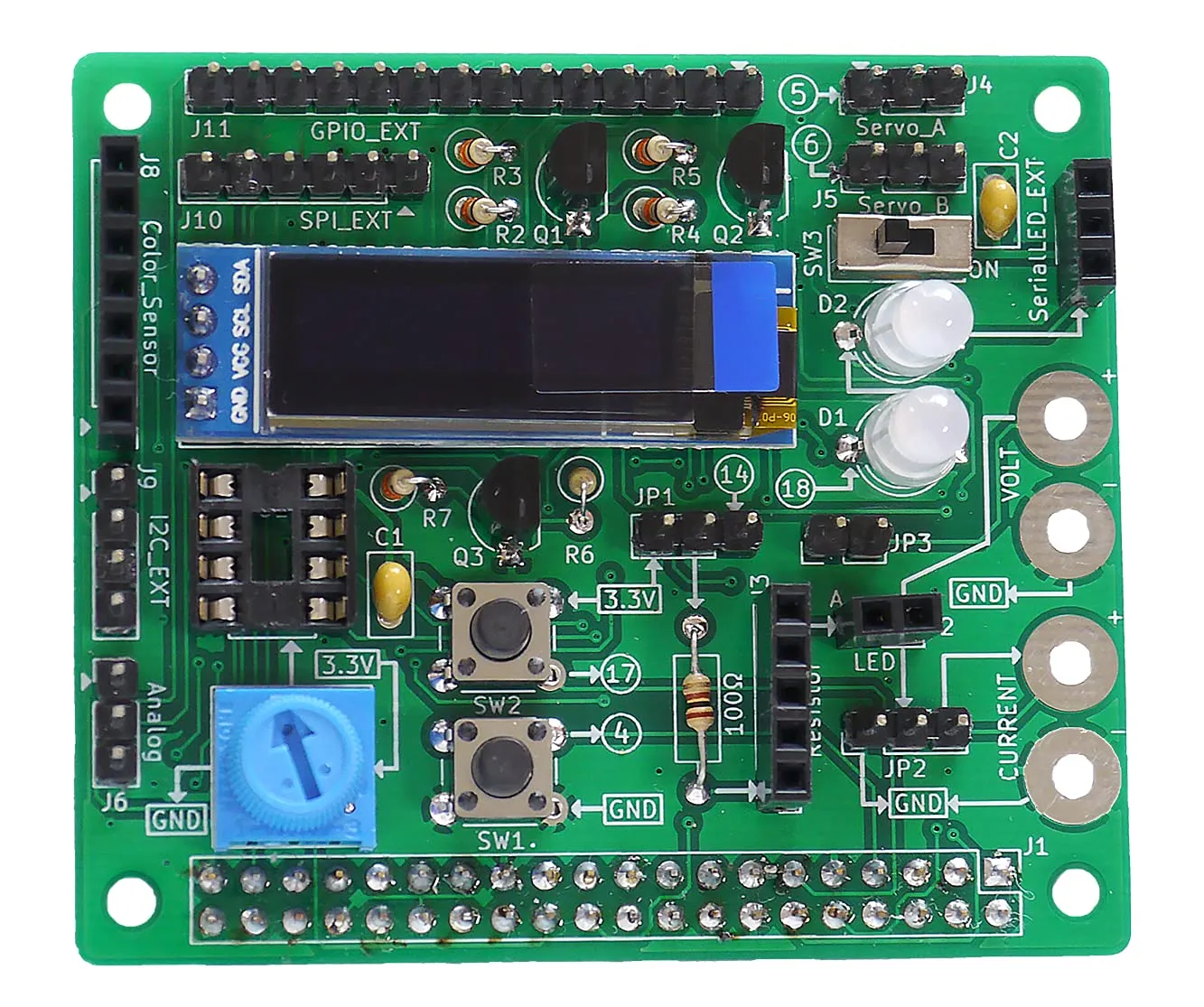 【外部接続端子】 外部LED ソケット x1 / 外部抵抗ソケット x1 / 外部LED 電圧測定端子 x1 / 外部LED 電流測定端子 x1 / 14pinGPIO x1 / 4pin I2C x1 / 6pin SPI x1 / カラーセンサ用端子 x1 / 3pin アナログ端子 x1 / 3pin シリアル LED(NeoPixel シリーズ)出力端子 x1 / サーボモータ接続端子 x2