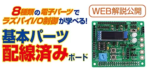「基本パーツ配線済みボード」はRaspberry Pi でI/O 制御を学ぶための学習ボード。LED や抵抗からサーボモータや有機EL ディスプレイまで8 種類の電子部品についてラズパイでの制御方法を学ぶことができます。
