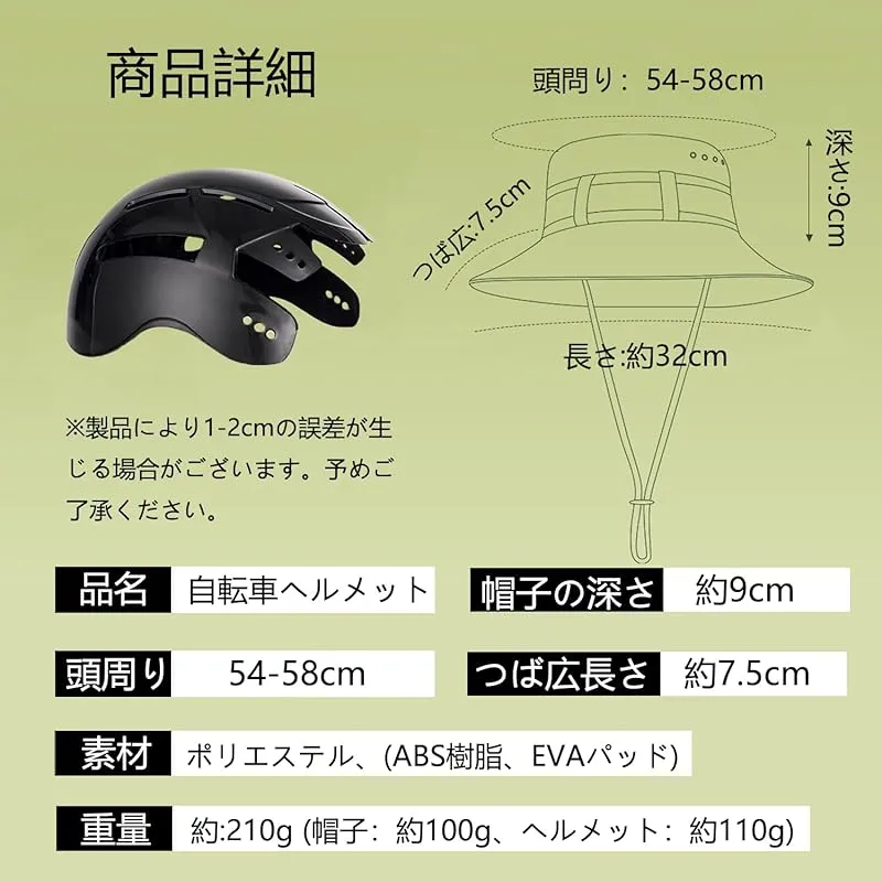 【商品仕様】対応サイズ: 頭囲約:54-58CM、軽量コンパクト設計:総重量(約):210g (帽子:約100g、ヘルメット:約110g)。※ご注意:購入前に必ず自分の頭囲を確認しましょう、サイズの測定について額から後頭部の周長を測定して、そのデータによって購入を検討してください。(ご注意:出荷時は帽子と内蔵ヘルメットが分離しており、未装着状態です。)