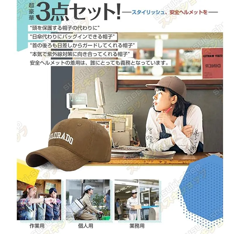 【軽量&紫外線対策】 帽子のデザイン性とヘルメットの性能を両立し、オシャレをしながら頭を守ります。約210gの軽量設計で疲れにくい。UVカットキャップ、つばの長いタイプで、日焼けや日差しから顔を守ります。紫外線は肌にダメージを与えるので、外出時には日よけ帽子が不可欠な単品、夏の強い紫外線に最適です。