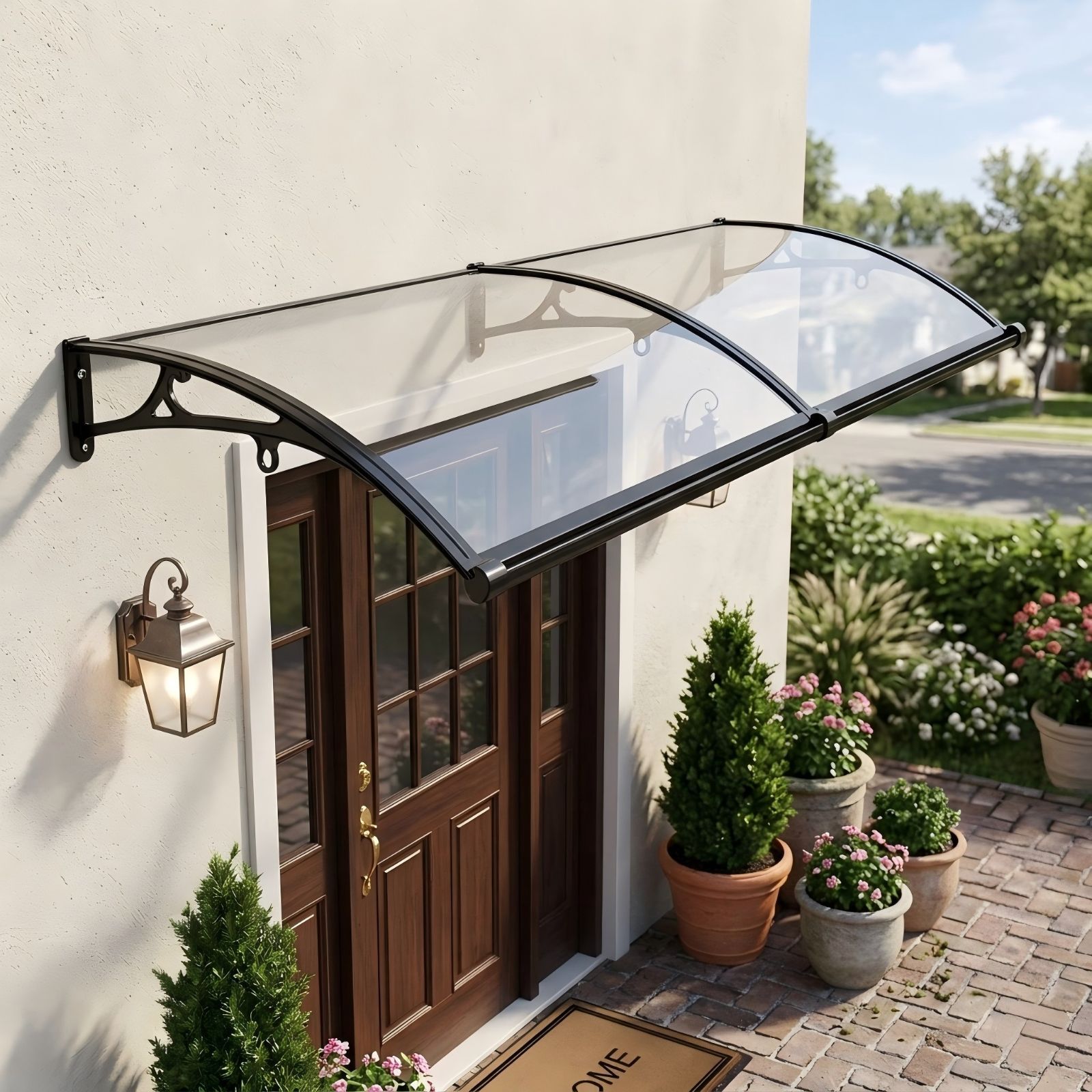 後付けで設置できる住宅用ひさしです。玄関や窓まわりを雨・雪・日差しから守り、外観をすっきり整えます。