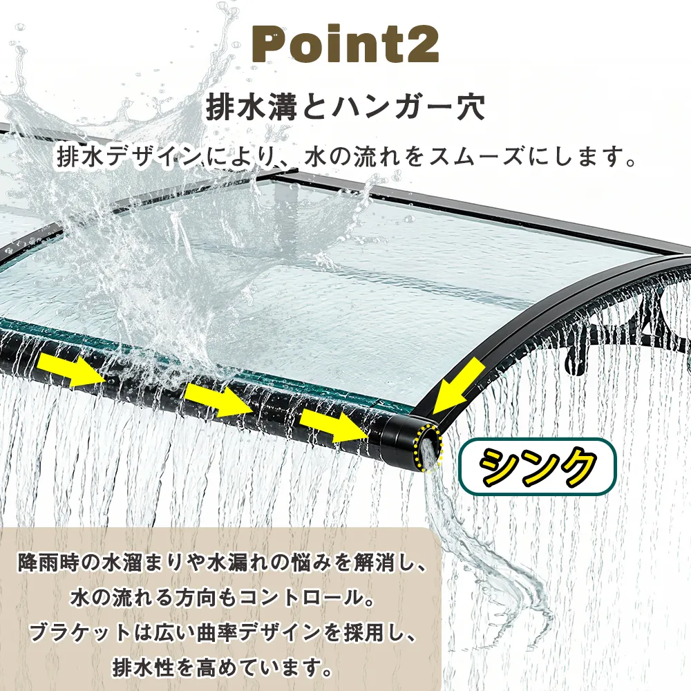 両サイドの排水設計により、水の流れをスムーズにコントロール。ブラケットの形状にも工夫を施し、排水性を高めています。機能性と見た目を両立した実用的な仕様です。