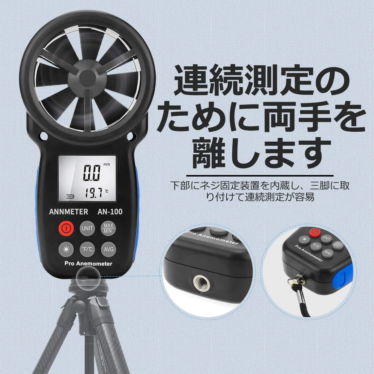 【三脚固定対応】風速計 ハンディ底面1/4インチネジ穴付き(長時間計測時手ぶら操作可能)。バックライト付大型LCDで暗所/日光下でも視認性抜群。