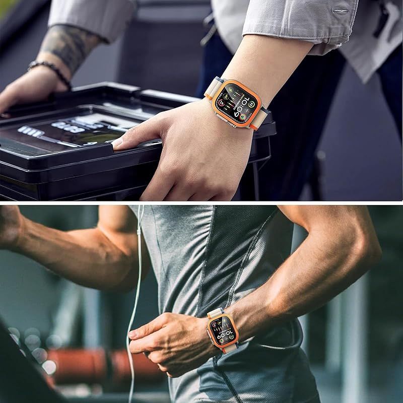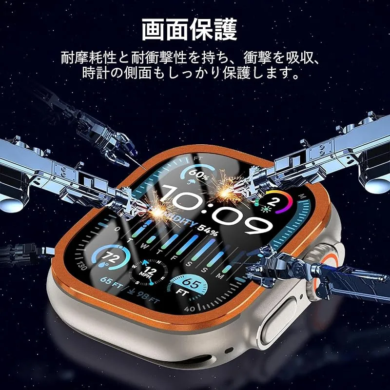「チタン合金フレームApple Watch Ultra 3/2/1保護フィルム」チタン合金フレームのApple Watch Ultra 3/2/1保護フィルムはApple Watch Ultra 3/2/1本体と同じ素材のチタン合金+硬度9Hの強化ガラスフィルムを採用し、Apple Watch Ultra 3/2/1の画面から端までを保護し、耐磨耗性と耐衝撃性に優れ、ぶつけたりしても安心して使い、より全面的な保護を提供します。
