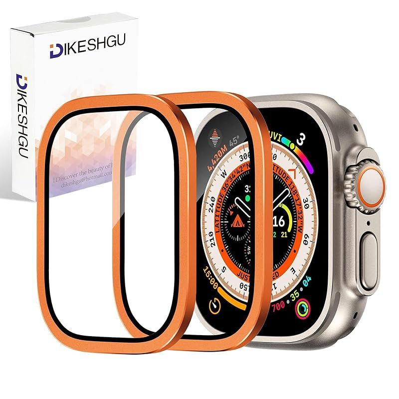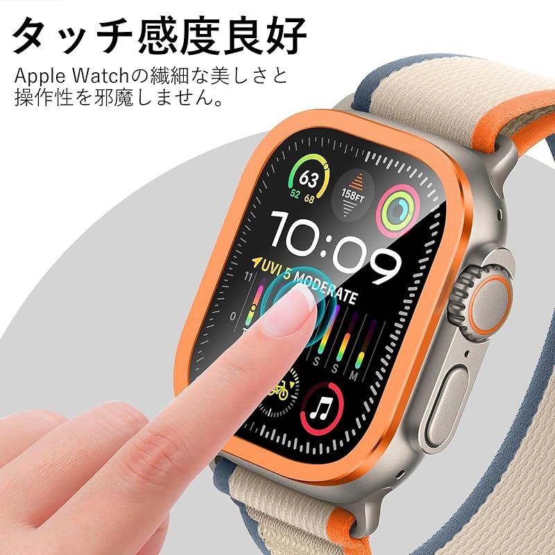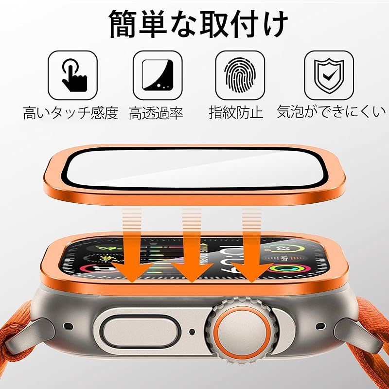 【ステンレススチールフレーム+強化ガラスフィルム 一体型】 全面保護 アップルウォッチ Ultra 49mm 画面保護カバー 耐傷性 指紋防止 (2枚セット,オレンジ)