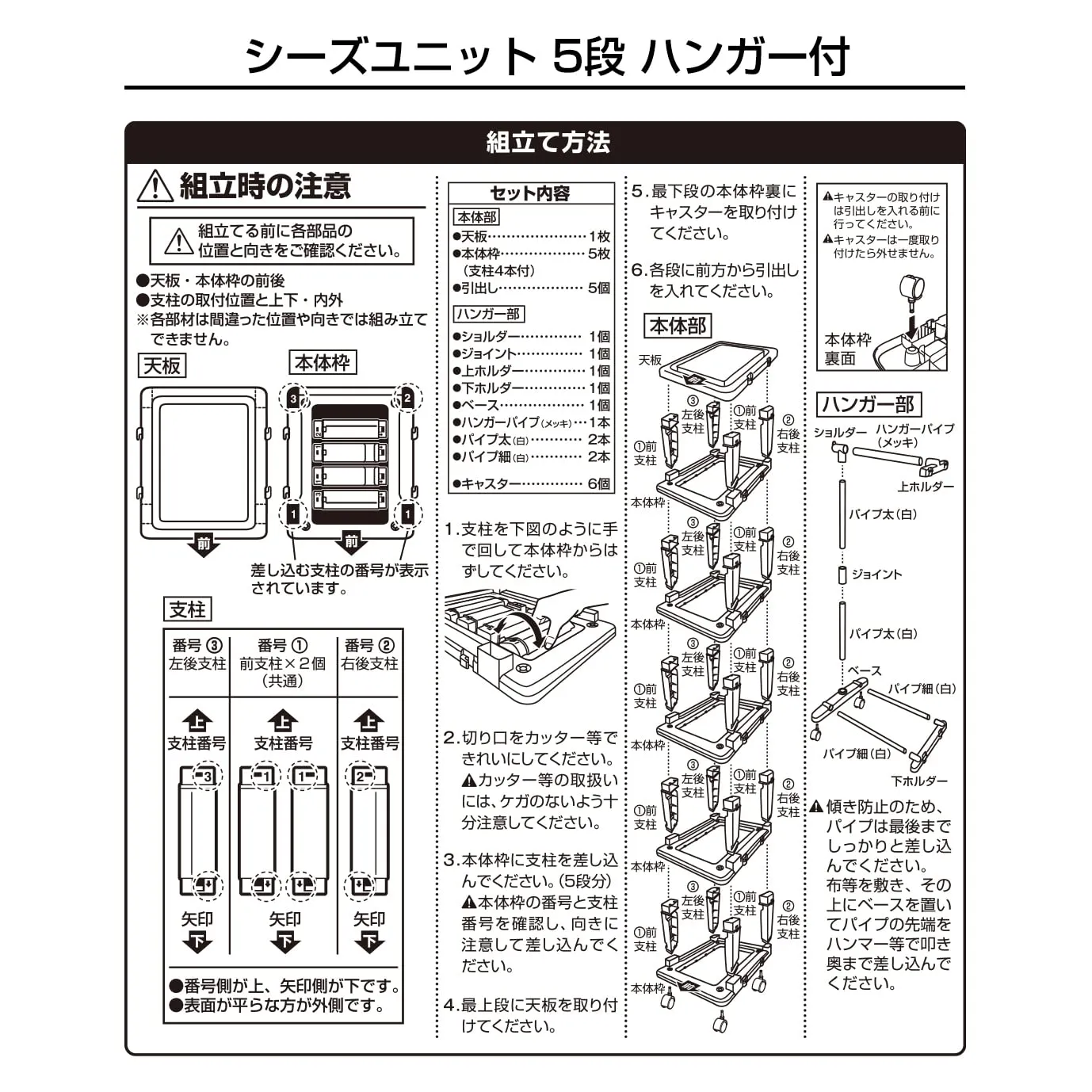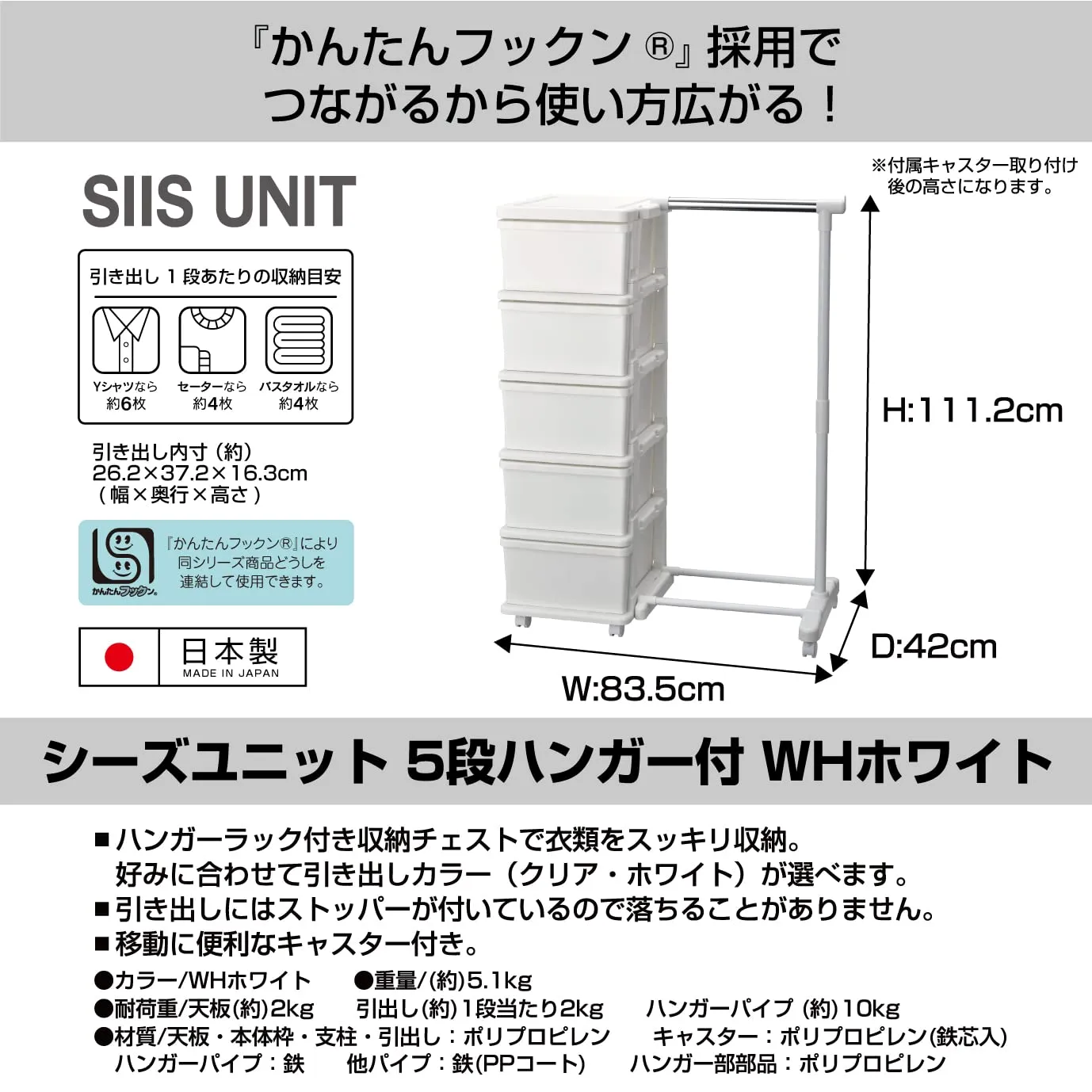 JEJアステージ(JEJ Astage) JEJアステージ 収納ケース シーズユニット5段ハンガー付 ホワイト 簡単組立 日本製 幅83.5×奥行42×高さ111.2cm