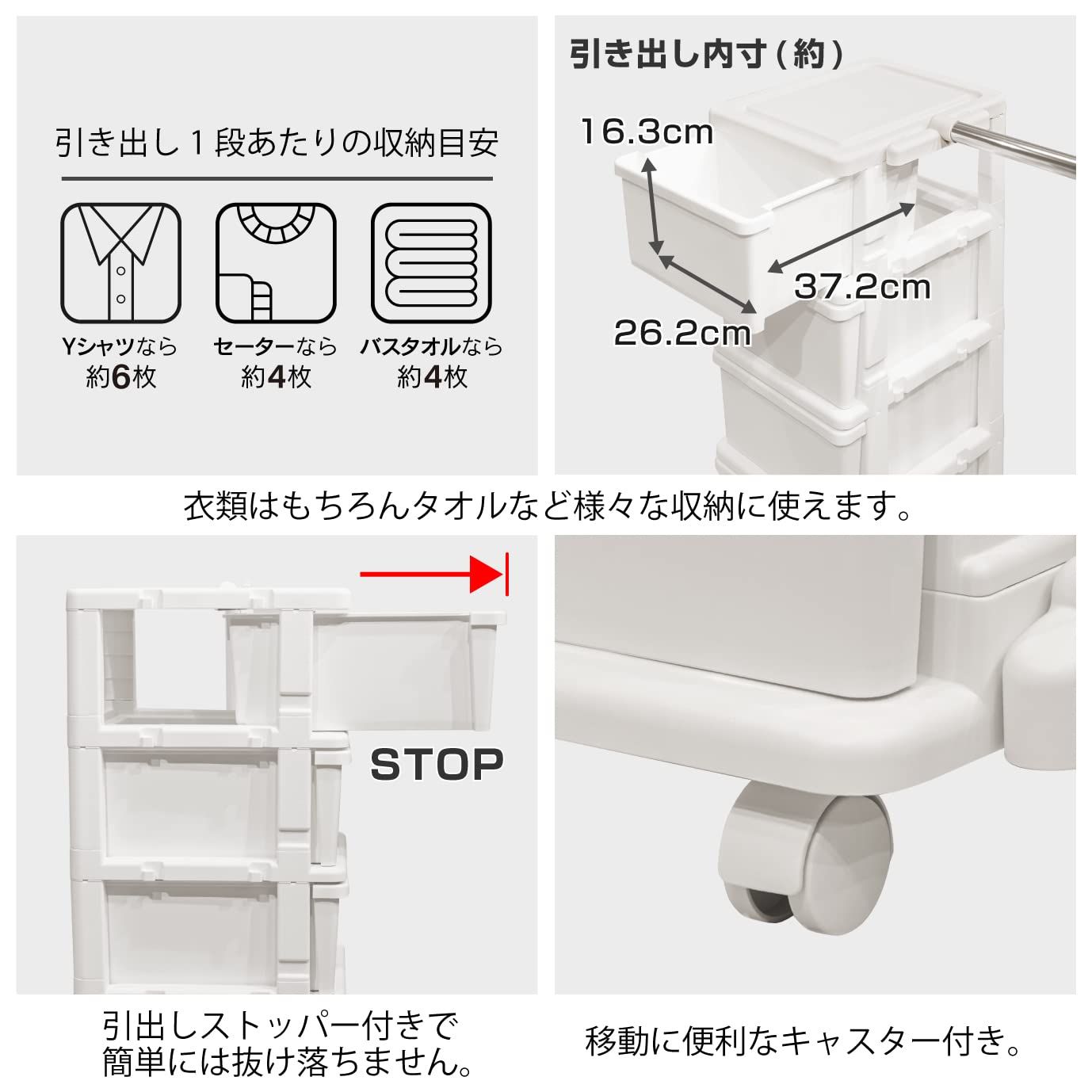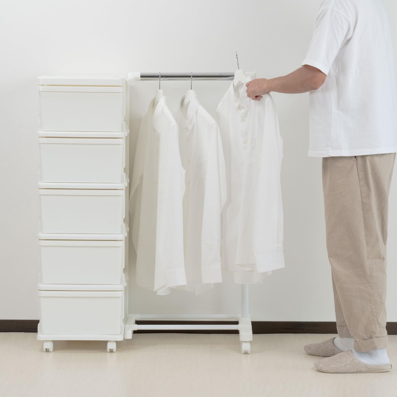 掛けるモノとたたむモノをひとまとめにできる、ハンガーラック一体型チェスト