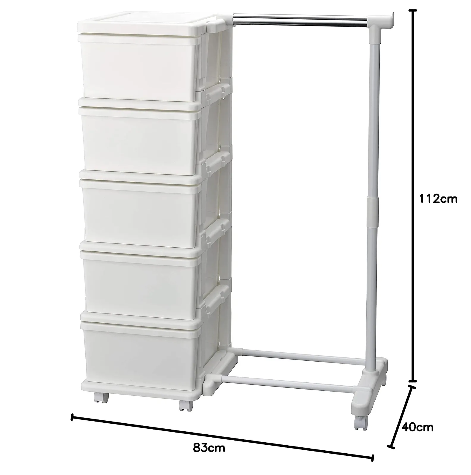 ハンガーラックとチェストが1つに かける収納と引き出しが一体化。チェストは5段。本体サイズは幅83.5cm、奥行き42cm。チェスト部の高さ103.3cm、ハンガーラック部の高さ108.3cm。