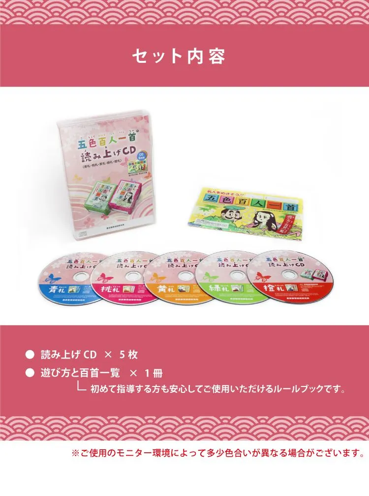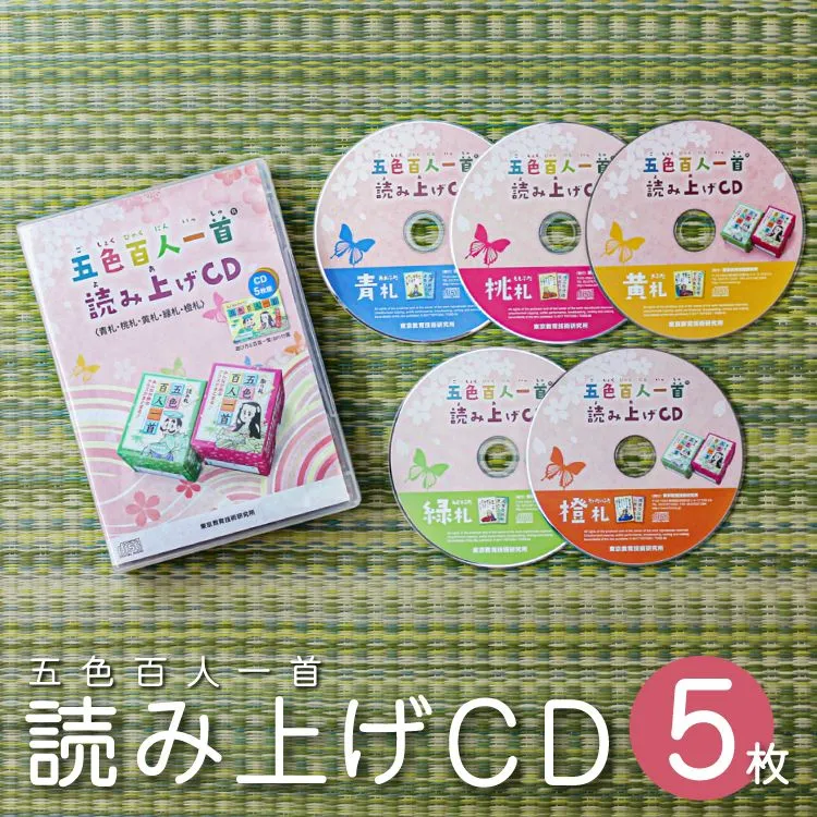 1色20首を1枚のCDに収録、計5枚が入った五色百人一首用の読み上げCDです。