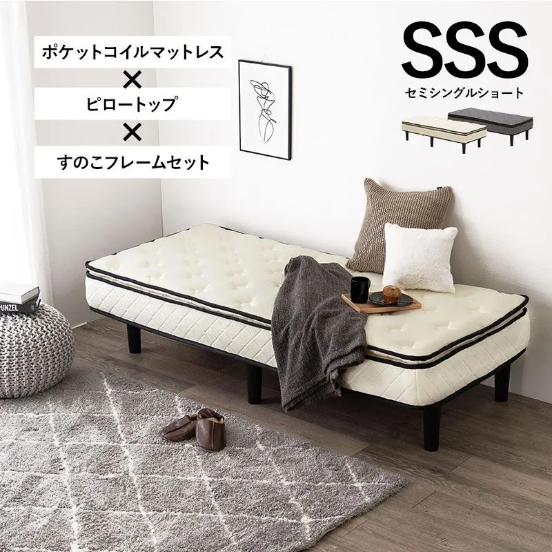 【商品説明】 ふかふかなピロートップ仕様のマットレス付きすのこベッド。高級ホテルのような贅沢で快適な寝心地をご家庭で。SSS(セミシングルショート)サイズ。