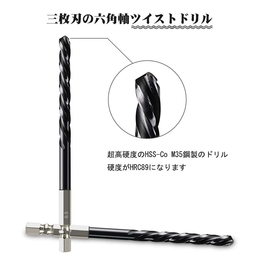 「適用範囲」ステンレス鋼に最適な溝形状で溶着が少なくスムーズな穴あけができます。被削材:ステンレス・難削材・一般鋼材・軽金属(鉄・アルミ・銅)・木材・樹脂など。また軸の形状が六角軸なので、インパクトドライバー・電気ドリル・充電ドリル対応します。