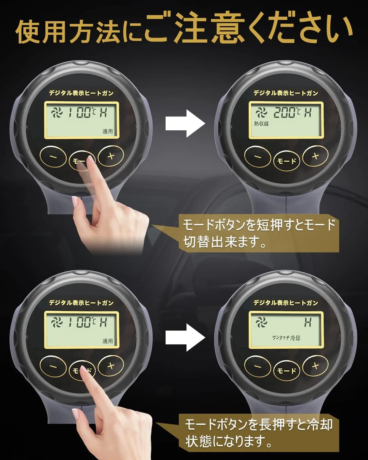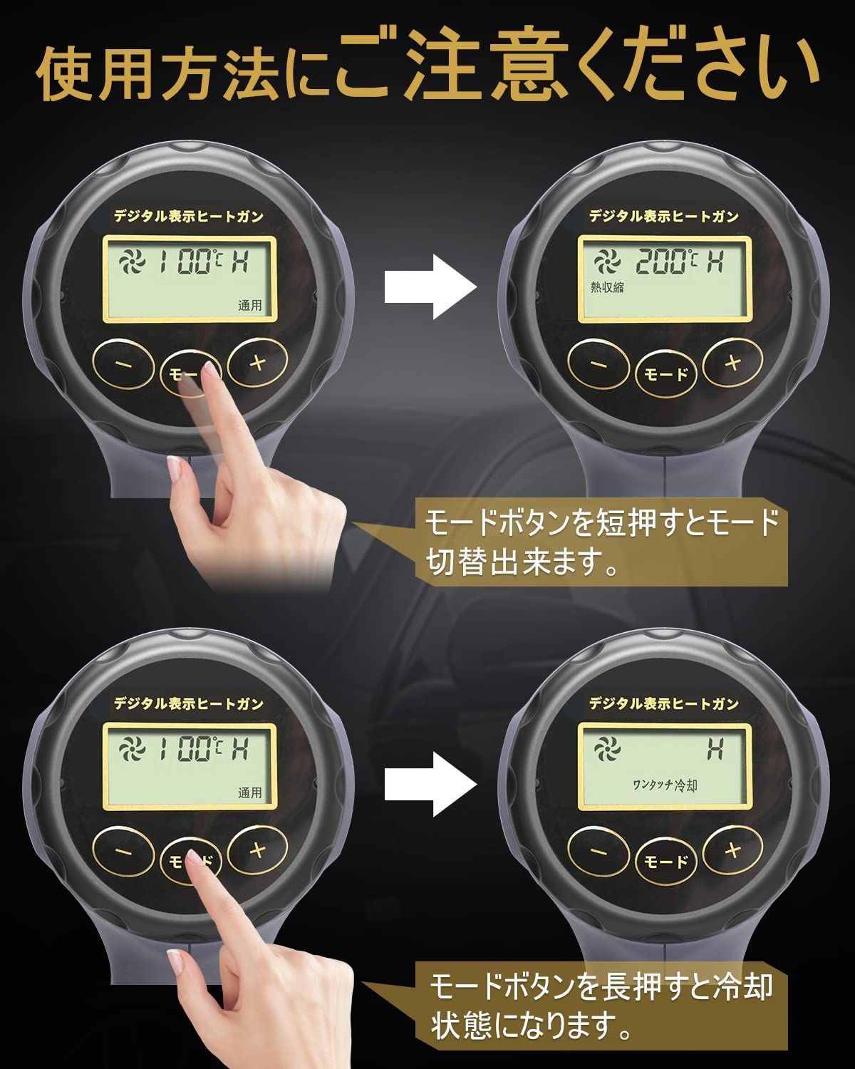 【作業モード】ヒートガンの「II」段階目のスイッチでは、通常モード、熱収縮モード、フィルムモード、溶接モードが使えるようになります。調整単位は+-のボタンで10度単位で可能、-+の3秒の長押しで100度単位で調整できる。特に初心者にオススメです。