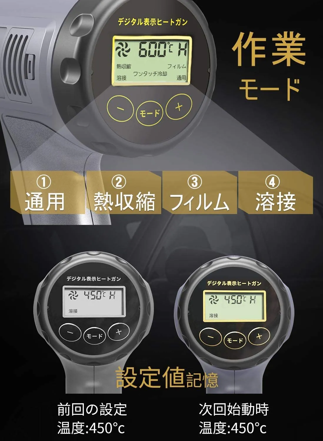 【液晶表示に温度調整】従来型とは違い、こちらのヒートガンは液晶画面に温度調整でき、作業の目安が分かりやすい。その上、設定値が電源を切っても記憶しているので、次回始動時も同じ温度設定から利用できます。