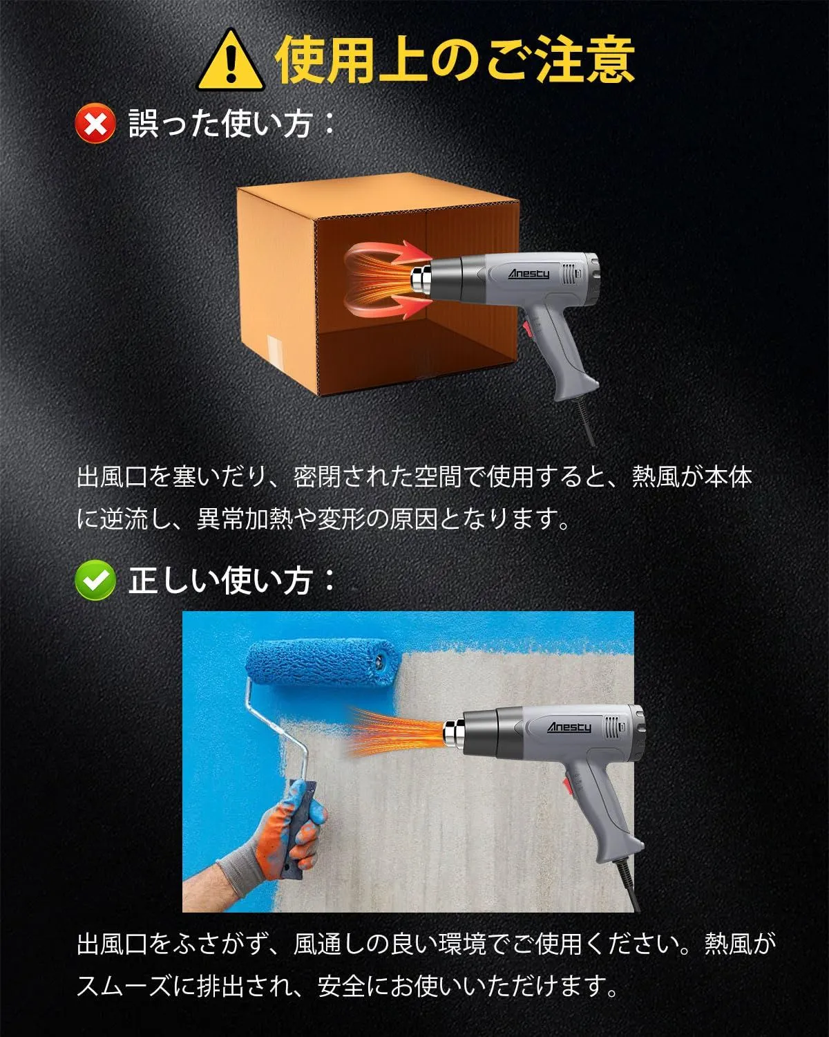 【日本規格で安全安心】①日本PSE認証済みヒートガン(安全安心)を取得済みヒートエアガンでございます。②電源:AC100V 50/60Hz(日本のコンセントに対応)。