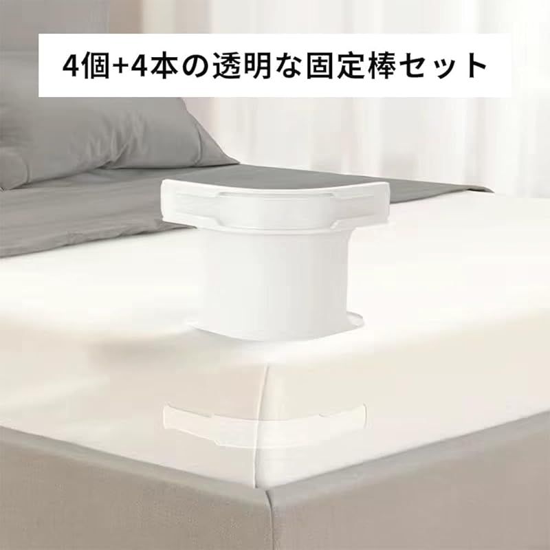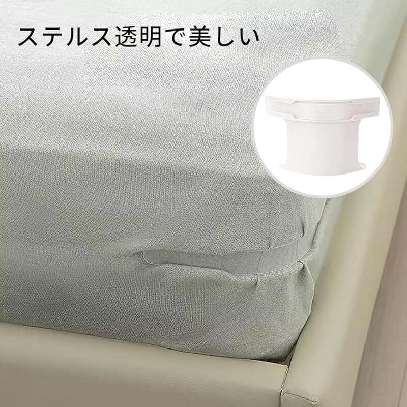 【目に見えないデザイン-家具に違和感がない】固定器具はシーツに隠れていますし、透明なバンドで目立たず、外から見ても違和感がないのが嬉しいポイント。ベッドの雰囲気を損なわず、すっきりとした見た目が保てます。プラスチック製で滑らかな表面、布やマットレスを傷つける心配もありません。