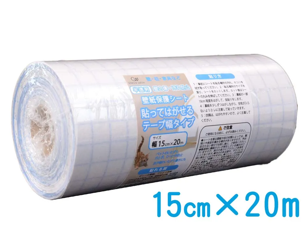 グリーンウィーク ペット壁紙保護シート (幅15cm×長さ20m) テープ幅タイプ (はがせる粘着シート) 半透明 壁、ドア、家具の傷、汚れ、ペットしつけ、猫ひっかき防止
