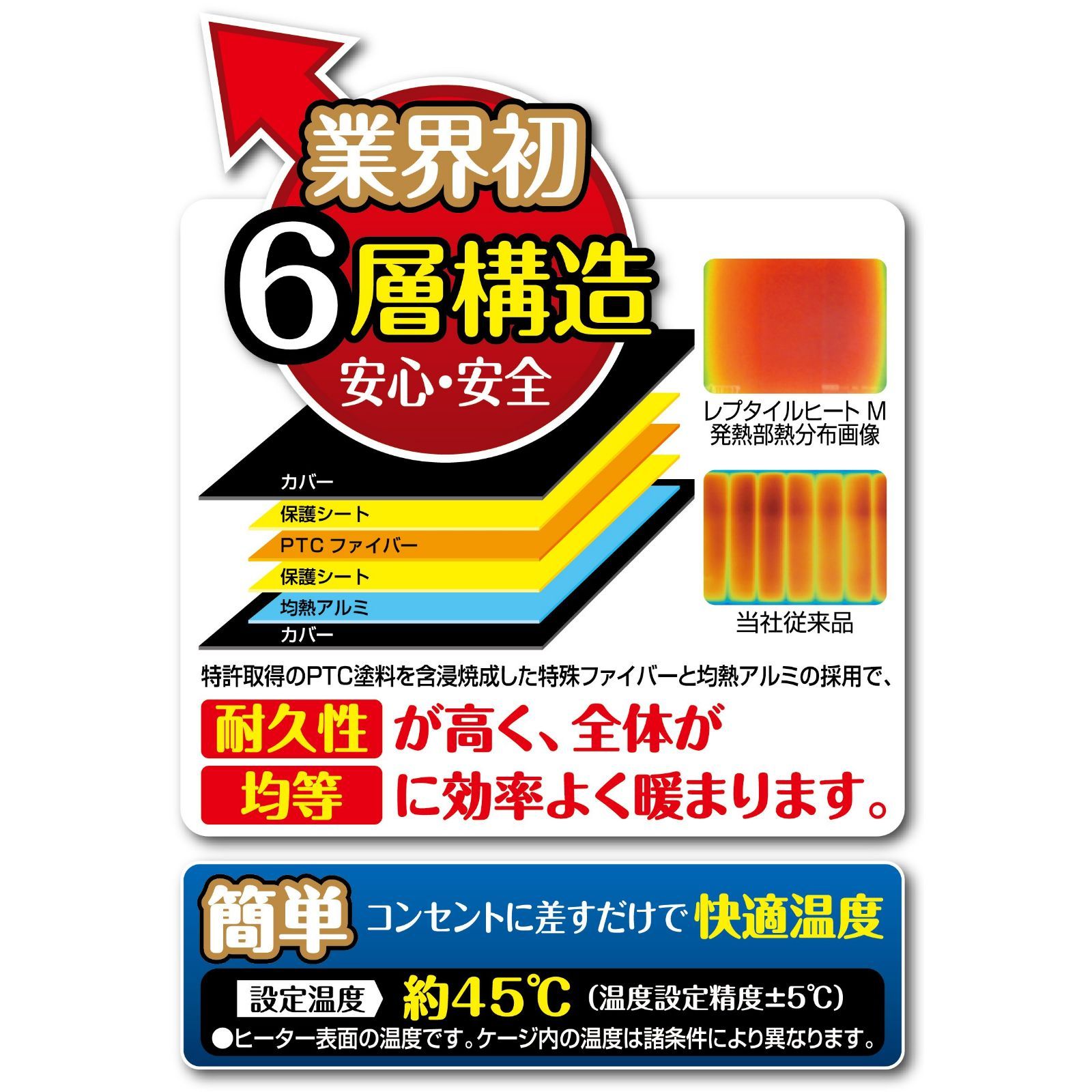 業界初 耐久性に優れ熱効率を高める安心安全の6層構造。 特許取得のPTC塗料を含浸燃成した特殊ファイバーと均熱アルミの採用で、抜群の耐久性と暖房効率の向上を実現しました。 本製品は住宅の床暖房として使用されている特殊ファイバー性のPTCを採用した自己温度制御式パネルヒーターです。 キズに強く高耐久を実現しました。 また均熱アルミの採用でヒーター全面が均一に暖まるので効率よくケージ内を暖めます。 急激な温度変化が生じにくいパネルヒーターは変温動物の爬虫類にとってやさしい暖房です 太陽があたためた大地のぬくもりを再現。 ・自己温度制御式(PTC)パネルヒーターとは・・・PTCとは温度が上昇すると抵抗が増え、電流を減少させる特性を持った物質のことです。レプタイルヒートは、このPTC特性を持つ「特殊導電性塗料」を採用しました。コンセントに差すだけで、ヒーター表面温度を一定(45度±5度)に保ち、爬虫類の快適温度を作ります。 ・使用方法簡単。コンセントに差すだけ。 ・コードの向きが気にならないリバーシブルタイプ採用で表裏どちら向きにも使用出来るのでコンセントに無理なく接続可能。 ・トラッキング防止プラグ使用 ・異常電流遮断機能(電流ヒューズ)採用 ヒーター本体最大外形サイズ:14.5×17.6cm(コード部を除く) 設定温度:45度(設定精度±5度)※ヒーター表面の温度です。ケージ内の温度は諸条件により異なります。 消費電力:6W 1日の電気代:約8.6円(1日24時間使用、1kWh=25円の場合) 適応ケージの目安:幅20~30cm 対応ケージ:グラステラリウムナノ、グラステラリウムナノキューブ、グラステラリウム3030、グラステラリウム3045